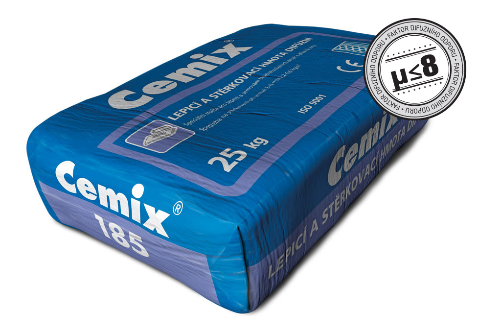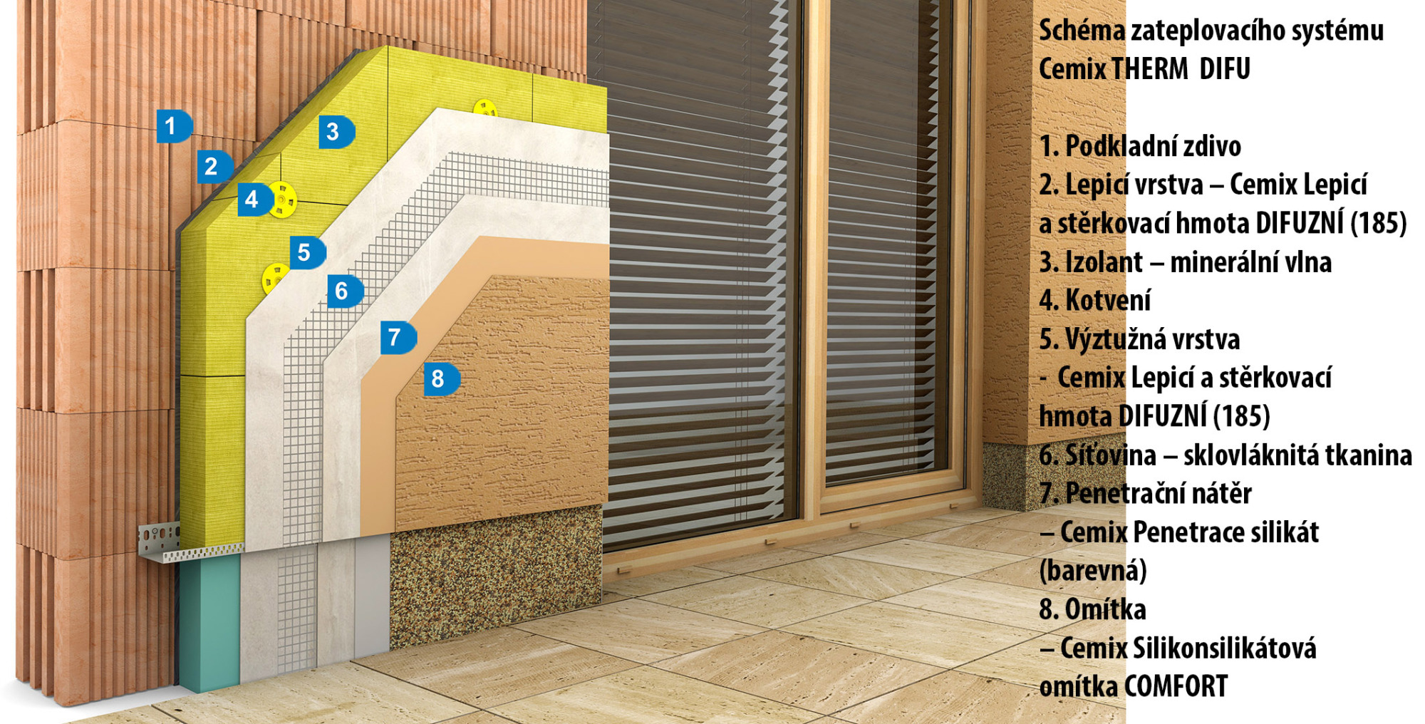 Základem systému je izolace z minerální vlny, která se lepí na fasádu Cemix Lepicí a stěrkovací hmotou DIFUZNÍ (185). Tato lepicí hmota obsahuje vysoký podíl provzdušňovacích přísad a udržuje si i po vyzrání přirozeně pórovitou strukturu. Díky tomu se vyznačuje vynikající paropropustností, resp. nejnižším faktorem difuzního odporu (µ ≤ 8).