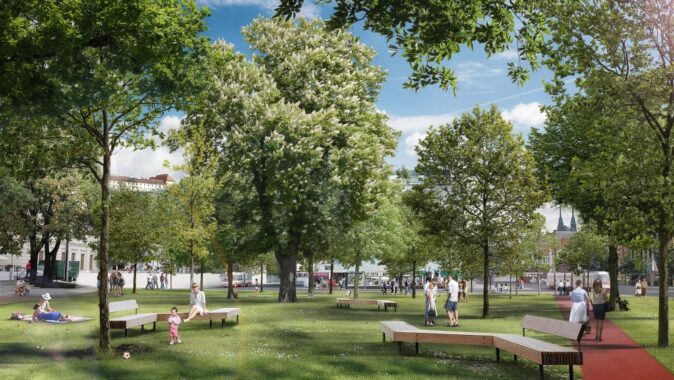 Na prostor dopravního terminálu na jižní straně náměstí navazuje nově vymezená pinzeta příjemného měřítka, s domy rámujícími průhled na baziliku. Rozšíření stávajícího parčíku až po novou komunikaci protínající území odůvodňují autoři absencí dostatečně velkého pobytového parku v souvislosti s předpokládanou výstavbou v okolí. Návrh tak nabízí zklidněný prostor se zelení vhodně propojený s předprostorem pivovaru.