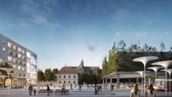 navržený solitérní objekt s tržnicí na zklidněné východní straně náměstí a ponechání