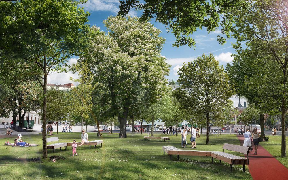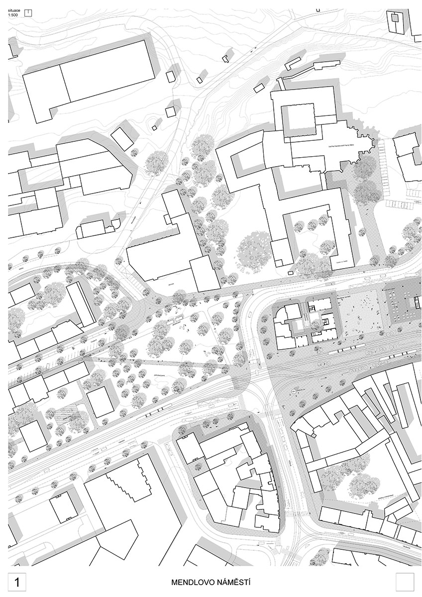 Na prostor dopravního terminálu na jižní straně náměstí navazuje nově vymezená pinzeta příjemného měřítka, s domy rámujícími průhled na baziliku. Rozšíření stávajícího parčíku až po novou komunikaci protínající území odůvodňují autoři absencí dostatečně velkého pobytového parku v souvislosti s předpokládanou výstavbou v okolí. Návrh tak nabízí zklidněný prostor se zelení vhodně propojený s předprostorem pivovaru.