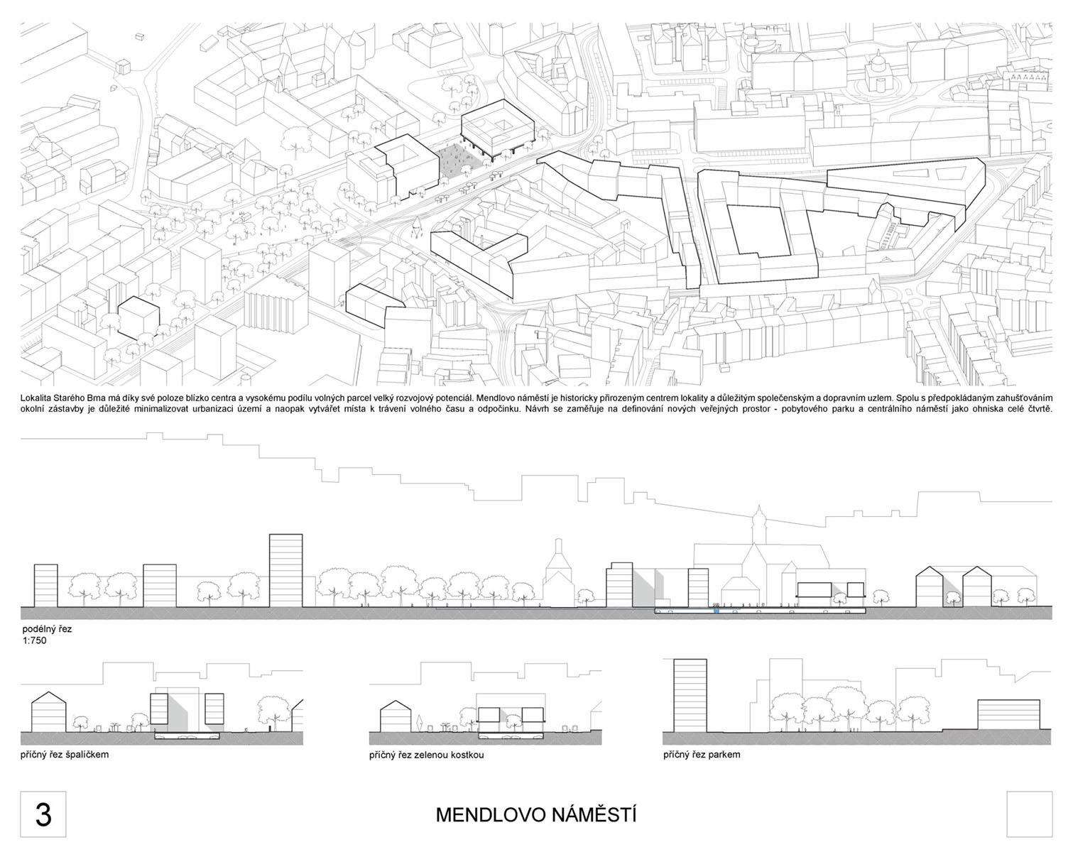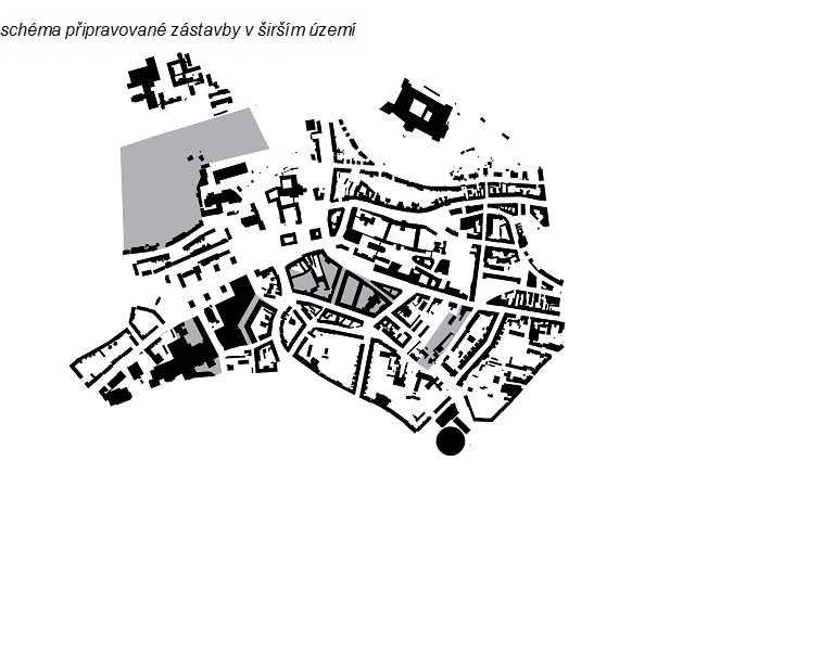 řešeného území pak utváří tři základní prvky: dostavba bloku uprostřed území, nově