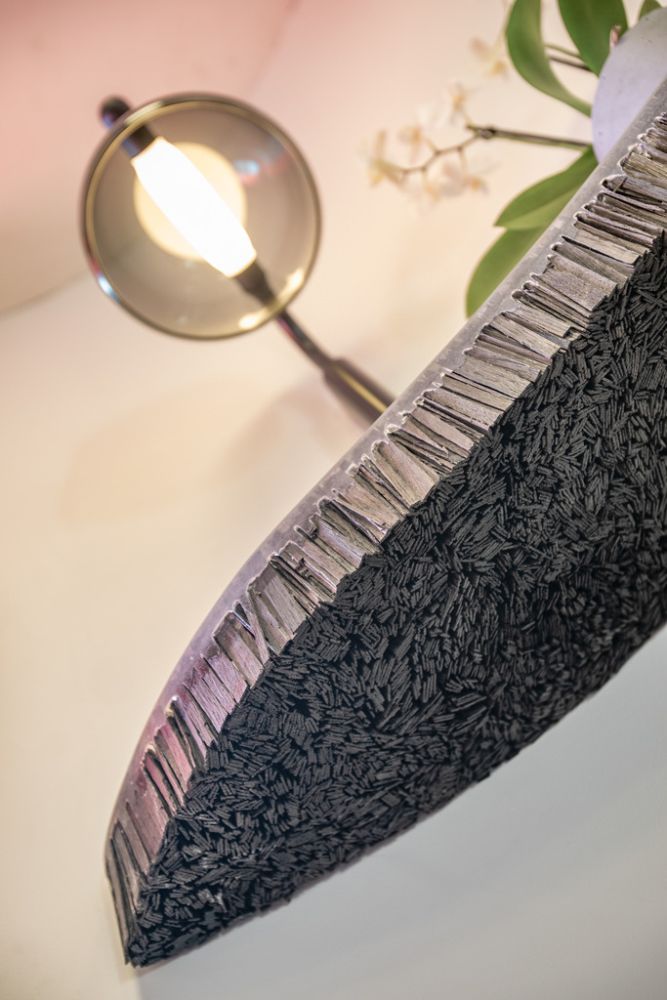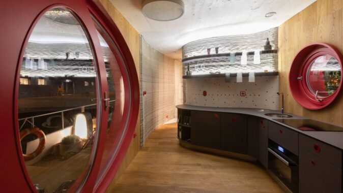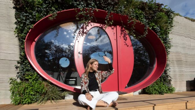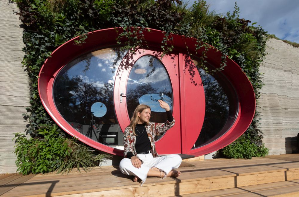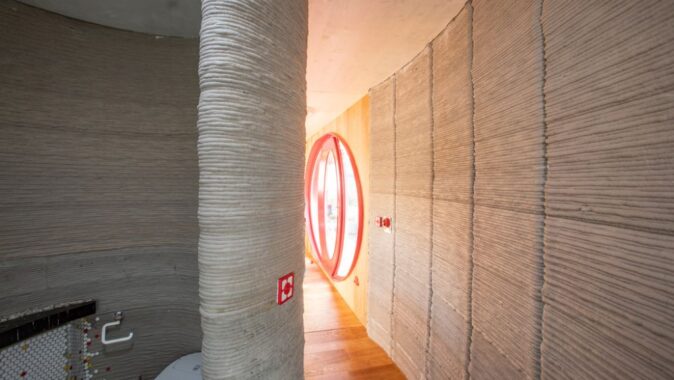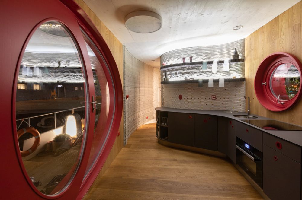 Křivky se promítají také v interiéru: příčky ho opticky dělí na koupelnu s toaletou, obývací pokoj s kuchyní a ložnici. Zároveň se ale jedná o jeden volně plynoucí prostor. Také 3D tisk z plastu tu má své uplatnění, jeho pomocí jsou vyrobené zásuvky, věšáky a vypínače. Baterie v koupelně je tištěná z kovu. Reproduktory pak 3D tištěné z písku a napuštěné pryskyřicí.