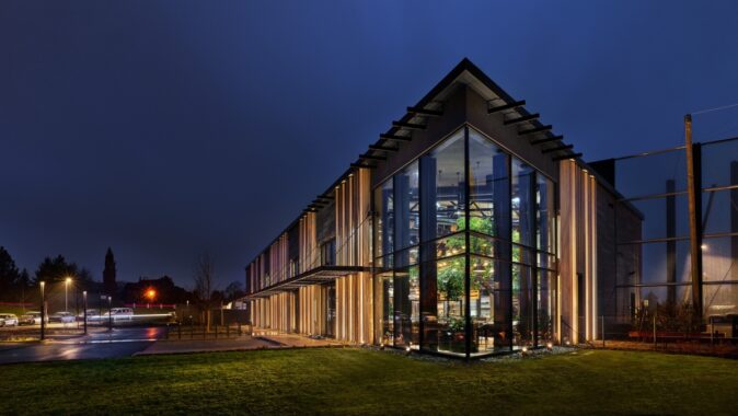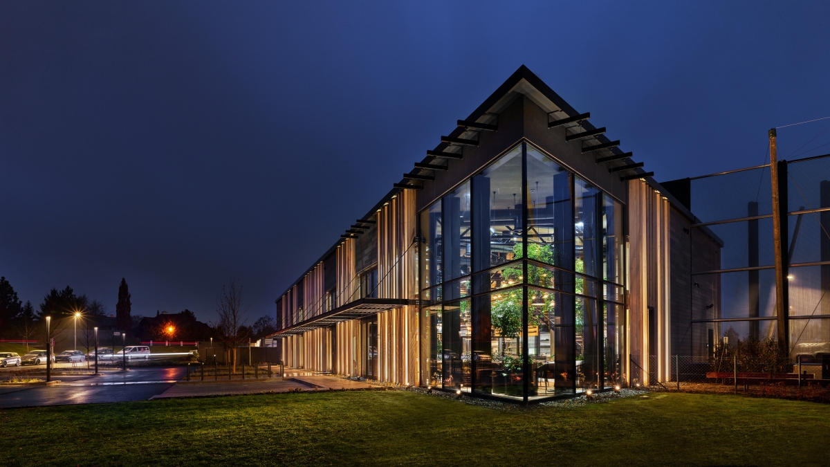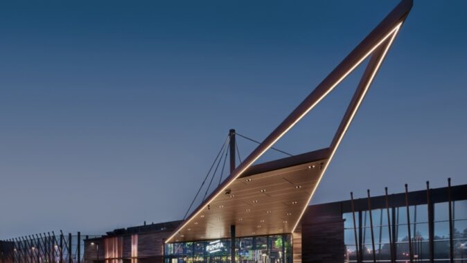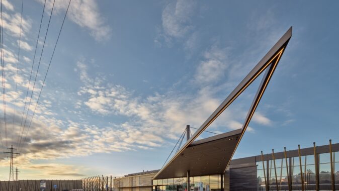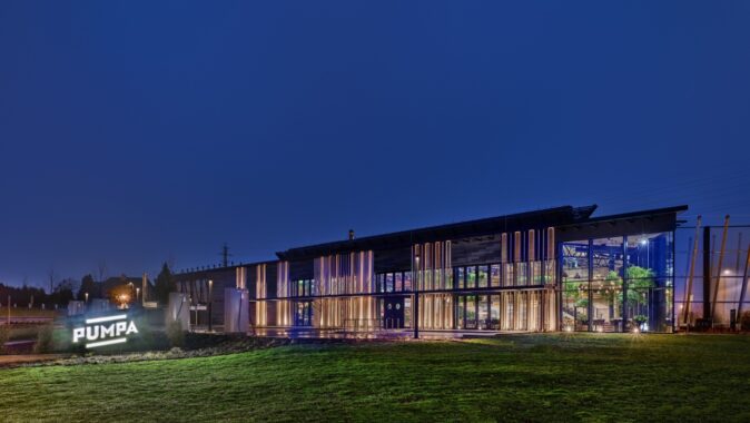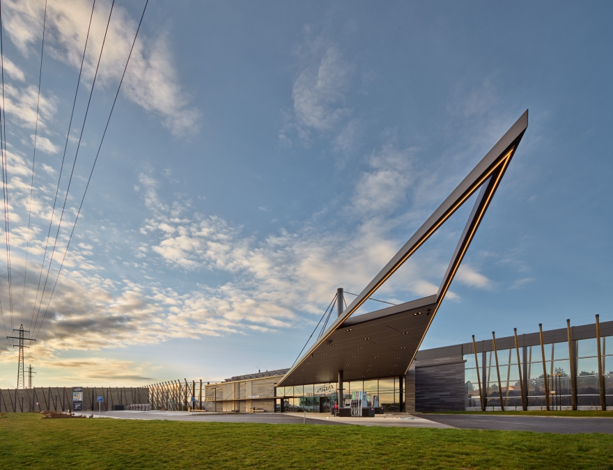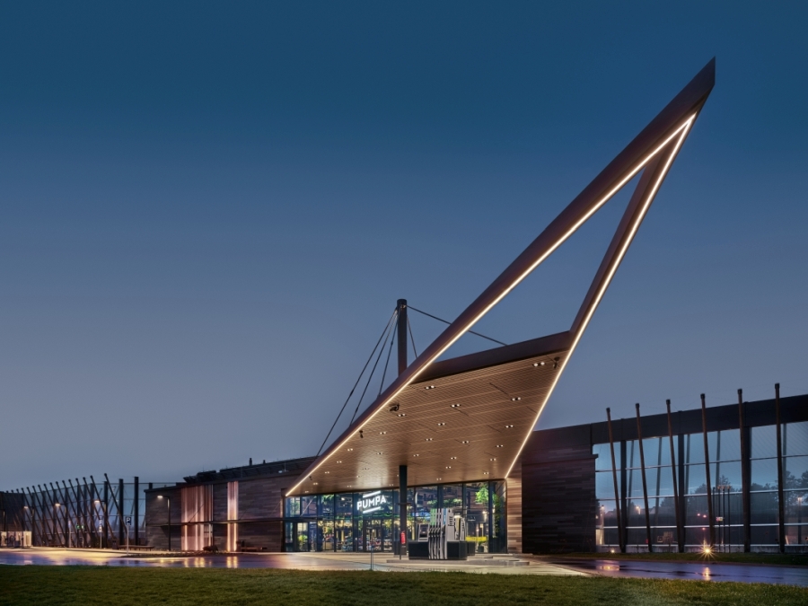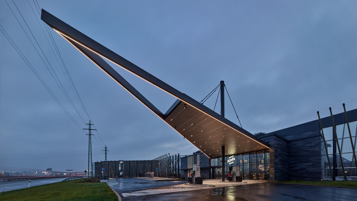 Multifunkční „PUMPA“ jako čerpací stanice, restaurace a protihluková stěna.