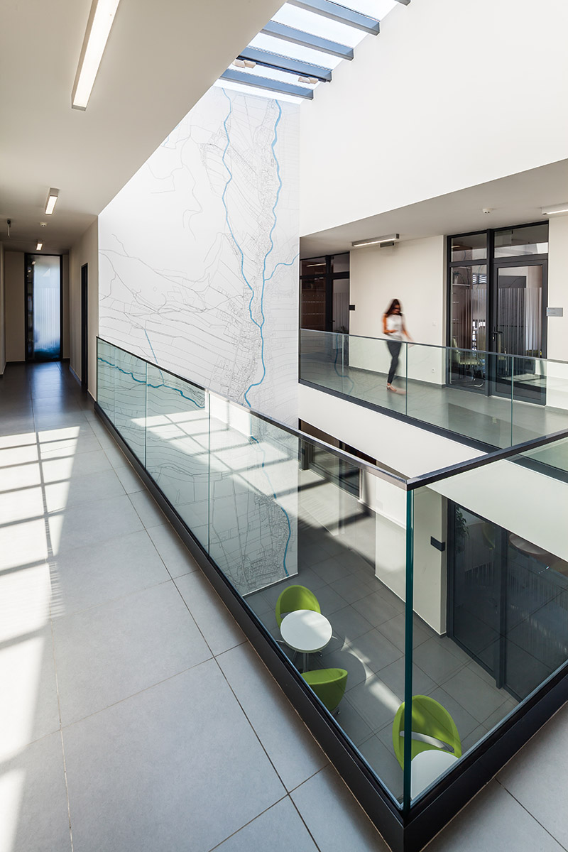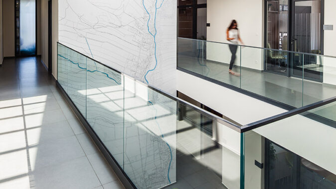 Hliníkový profil, držící zábradlí, je ukotven k nosné ocelové konstrukci. Stabilitu skel v profilu zajišťují speciální pomocné klínky a pryžové těsnění, které decentně kryje mezery mezi sklem a profilem. Horní hrany skla spojuje hliníkový U profil. Tvoří decentní madlo a zároveň chrání hrany skla před poškozením. Kalené bezpečnostní vrstvené sklo o tloušťce 16,76 mm v čirém provedení splňuje nejen požadavky normy, ale umožňuje i dodržet koncept „otevřené radnice“, tedy optické prostupnosti prostorového řešení, požadovaný architekty. Navíc je moderní a designovou součástí interiéru.