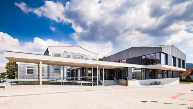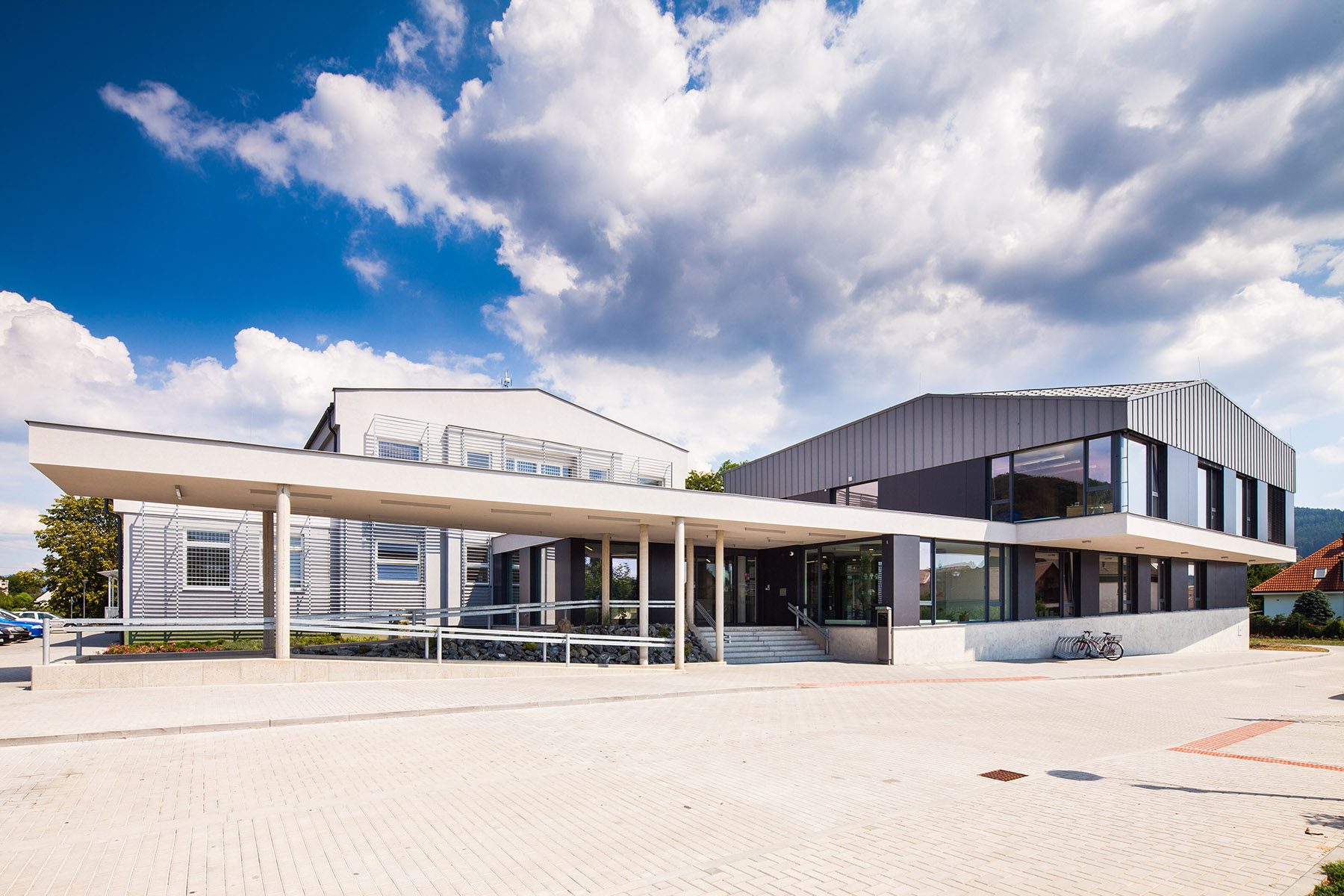 Nosnou konstrukci do výše střechy tvoří železobetonový skelet s vyzdívkou z keramických tvarovek a s kontaktním zateplení. Vnější rampa, obě schodiště a sloupy zastřešení rampy jsou z betonových prefabrikátů. Konstrukci střechy hlavní budovy tvoří lehká dřevěná konstrukce z příhradových vazníků. Fasády jsou řešeny v kombinaci světle šedé tenkovrstvé omítky a nekontaktního obkladu deskami Kronospan v tmavošedém odstínu. Nadokenní část obvodového pláště patra je obložena hliníkovým plechem PREFA se stojatou úhlovou drážkou, který tvoří i střešní krytinu.