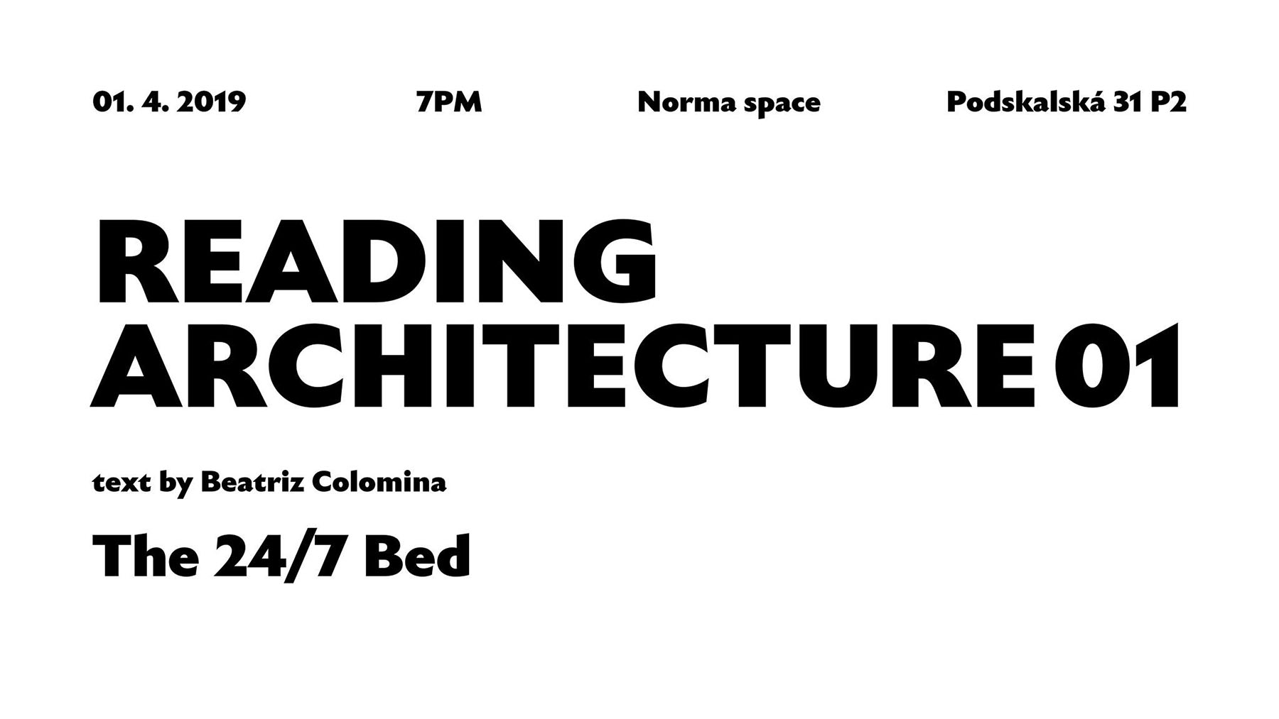 Reading Architecture 01 // Beatriz Colomina: The 24/7 Bed startuje novou doplňkovou sérii k výstavním aktivitám Norma Space. Reading architecture přináší prostor pro otevřenou diskusi nad aktuálními texty z oblasti architektury. Společně s hosty z řad architektů, teoretiků a sociologů budeme hledat a rozebírat témata ovlivňující současnou architektonickou praxi.
