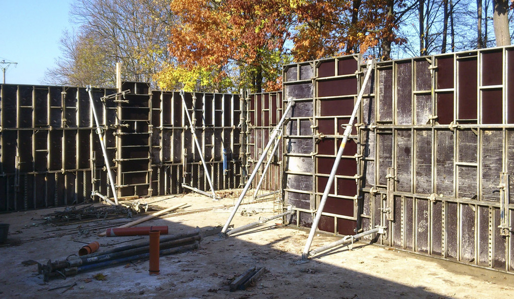 12) Betonáž stěn Při betonáži stěn je nutné (stejně jako u běžných konstrukcí) zabránit padání betonu z velké výšky. Se zvyšující se výškou padání betonu roste riziko rozdělení betonu a tvorba hnízd. Vibrace se provádí běžnými ponornými vibrátory a intenzita musí být přizpůsobena konzistenci betonu.