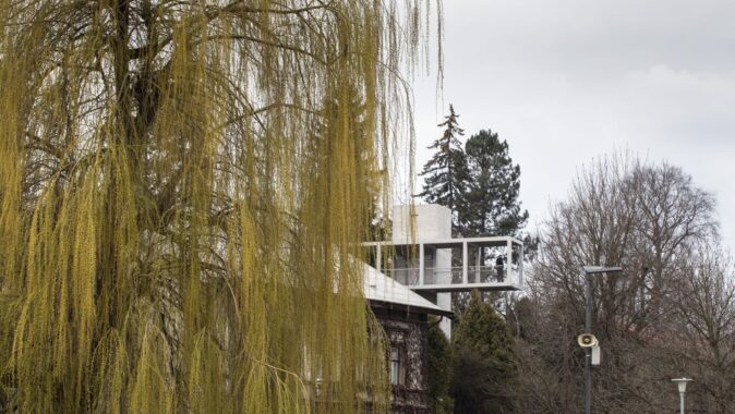 pohledového železobetonu. Důmyslná konstrukce umožnila lávku po celé