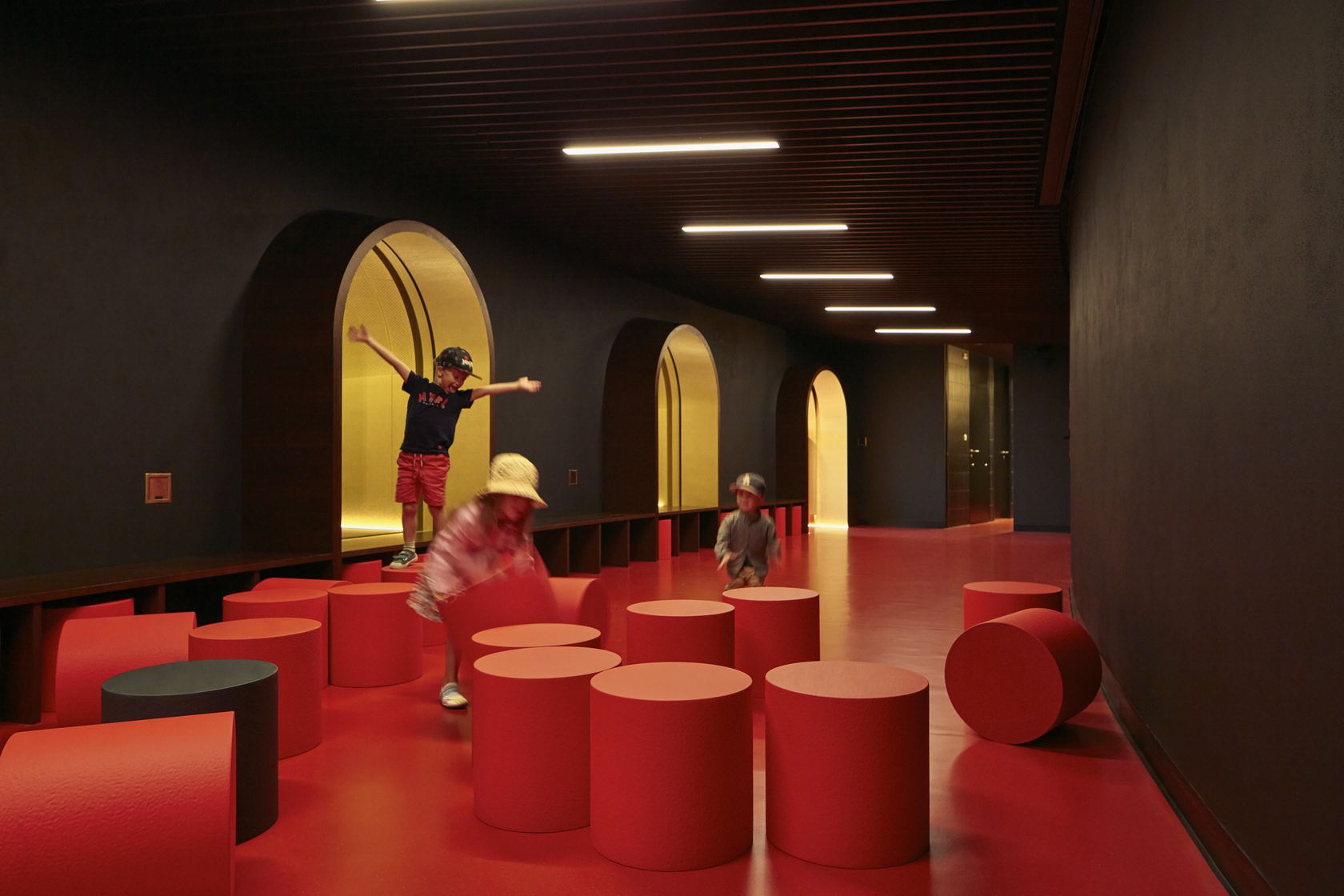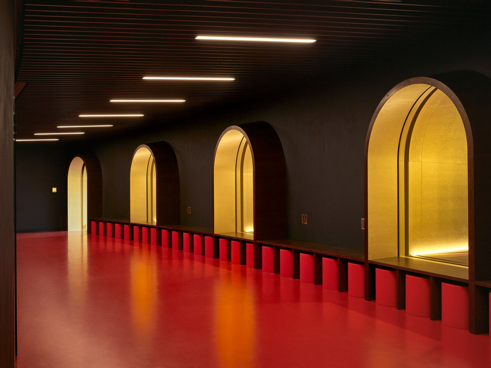 Celý příběh začíná ve vstupní hale, kde nás vítá slavnostní červená podlaha. Zde si i můžeme v šatně odložit, aby nám nic nebránilo vplout do Auditoria I, jehož prostor se pomalu stáčí ohraničený zvlněnou akustickou stěnou. V tmavomodrém prostoru doplněném pódii se zlatými klenbami začínáme nasávat příběh hudby pod večerní hvězdnou oblohou prvního koncertu České filharmonie v roce 1896 dirigovaného Antonínem Dvořákem. Mobilní sezení umožňuje veselou hru i poklidné poslouchání. Pódia v sobě ukrývají skladiště hudebních nástrojů, takže je jasné, že zde nevládne pouze romantický klid. Odtud pokračujeme přes Foyer, které tvoří čitelný předěl mezi hlavními sály a je střídmě zařízeno. Přes Foyer vstupujeme do Auditoria II, kde pod zlatou klenbou spí černé křídlo Petrof. Jako by čekalo na vhodnou situaci, kdy se rozeznít. Stěny jsou obalené akustickým obkladem ve starorůžové a tmavým dřevem, které reaguje na původní interiér. Zdejší noblesa nám maximálně připomíná, že se nacházíme v architektonickém klenotu. Jen lesklé magnetky schované v akustických deskách čekají na spontánní rozvěšení dětských kreseb a záznamů z výuky. Plni emocí a energie vstupujeme zpět přes Foyer do Respiria, kde se celý program završuje. Multifunkční prostor s lavicemi a taburety je maximálně svobodný, jen průhledy okny do Auditoria I nám připomínají provázanost všech prostor a ucelenost koncepce. Až se nám všechny myšlenky a vjemy usadí, můžeme skrze šatnu a vstupní halu centrum opustit. Zde každý příběh končí dobře.