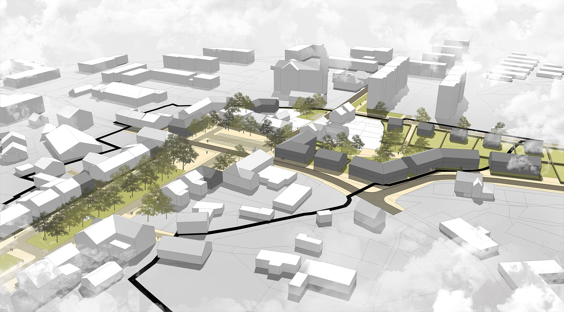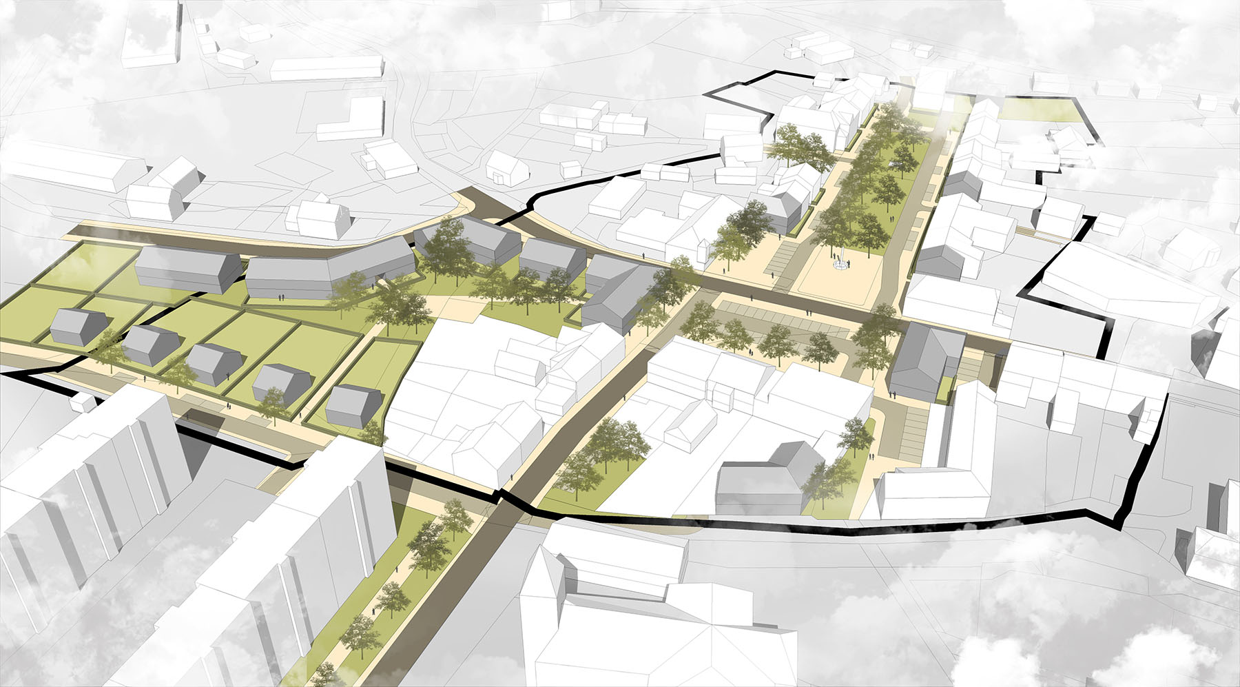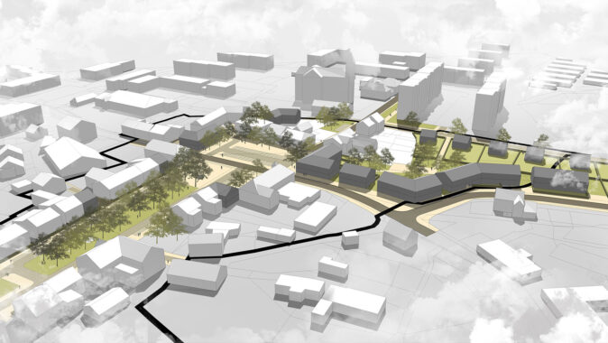 vybudovaná nová městská vybavenost jihovýchodně od původního centra.