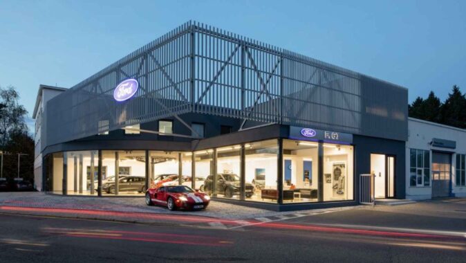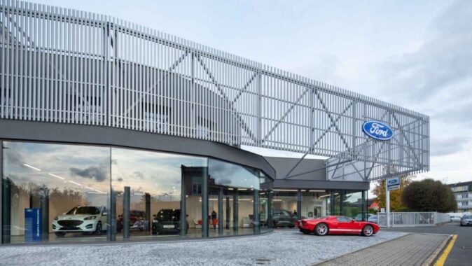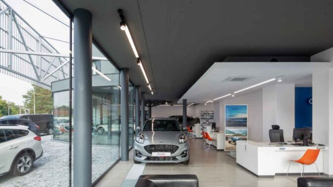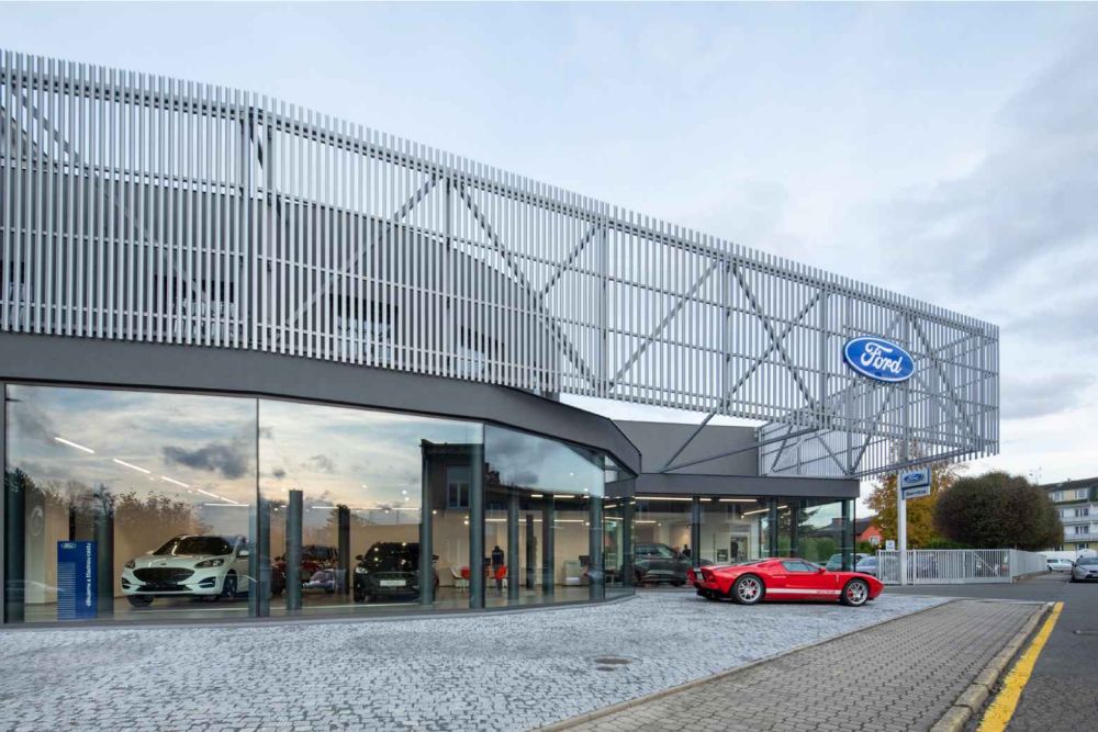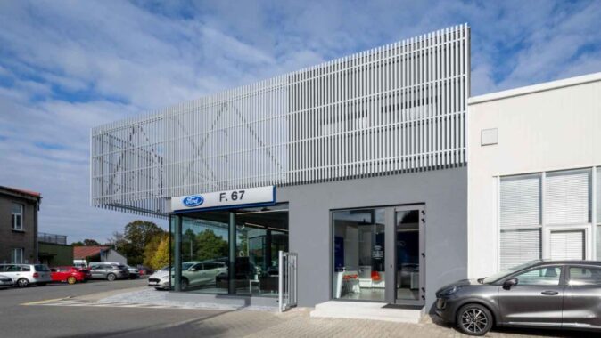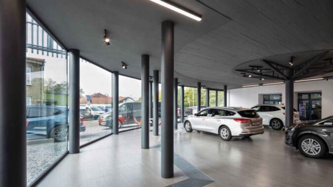 Dominantní výraz autosalonu teď tvoří hliníkové lamely na příhradové konstrukci, která se vznáší ve veřejném prostoru. Navrhli jsme demontáž stávající výlohy, abychom rozšířili kapacity prodejní plochy. Novou výlohu z velkoformátového zasklení jsme realizovali před původními sloupy z exteriérové strany fasády. V interiéru se podařilo odstranit kazetové stropní podhledy. Betonové stropy jsme očistili a částečně doplnili novými podhledy pro umístění osvětlení a klimatizace.