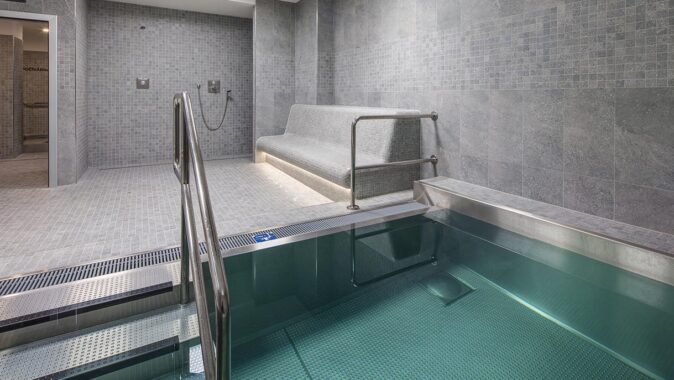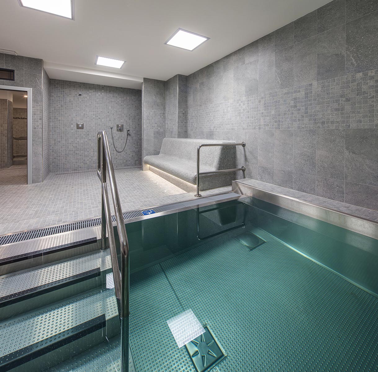 ochlazovací bazének, masérna, bar, šatny i sociální zařízení.