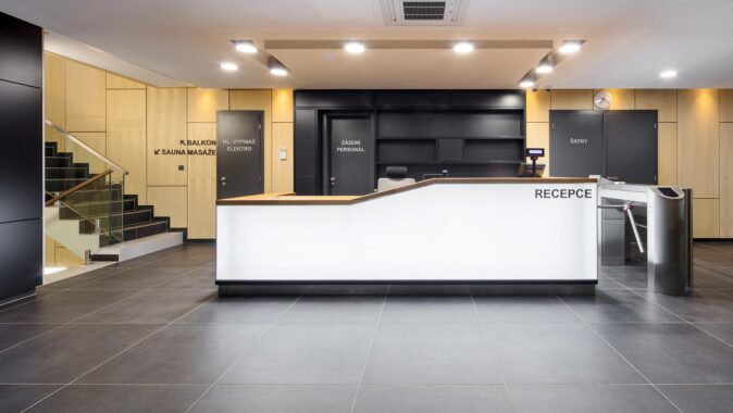 vzniklo zde navíc administrativní zázemí, prostor pro posezení a nová recepce. Elegantní