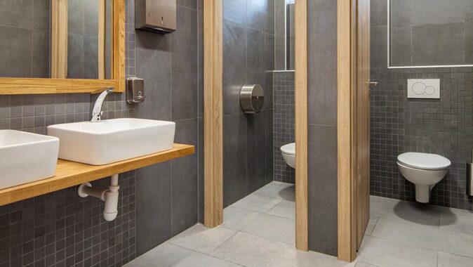 toaletách tvoří černé keramické dlaždice RAKO ze série Extra. Velký formát 80 x 80 cm