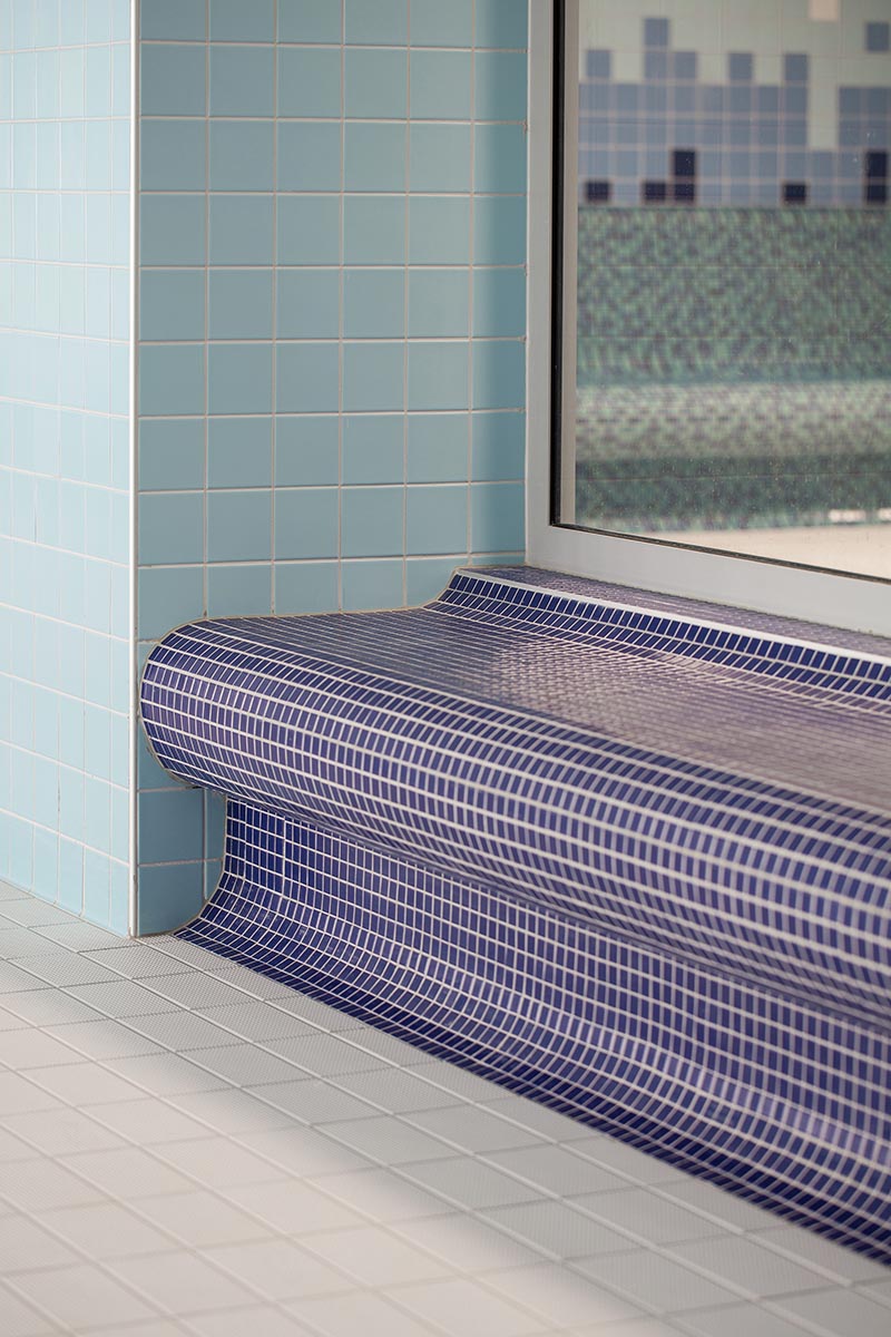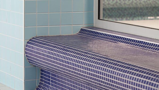 hale. Tady světle modrá mozaika pomohla vymodelovat atypické oblé tvary lavic určené