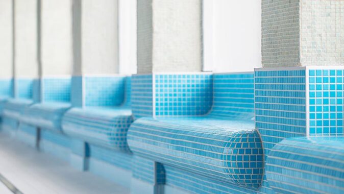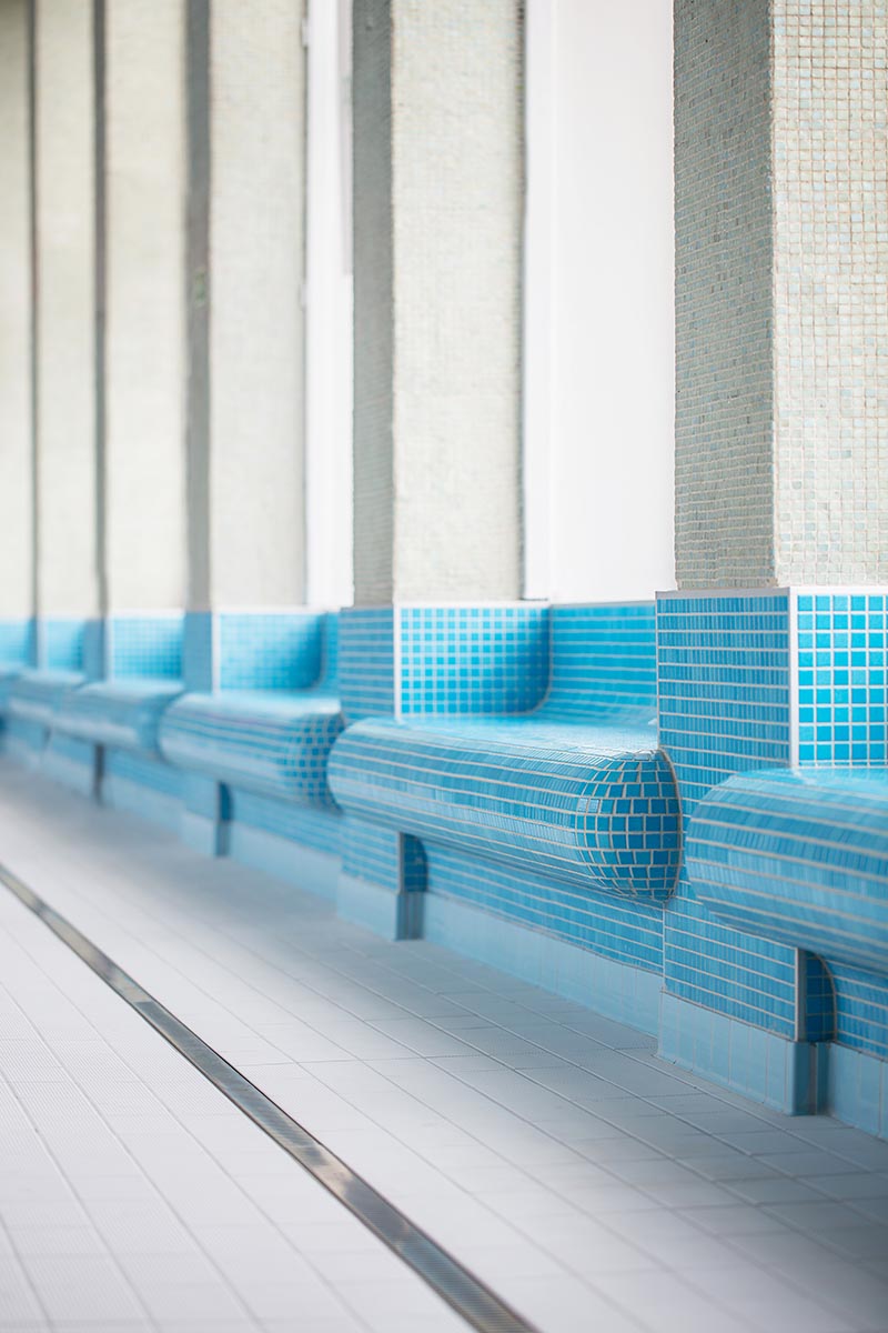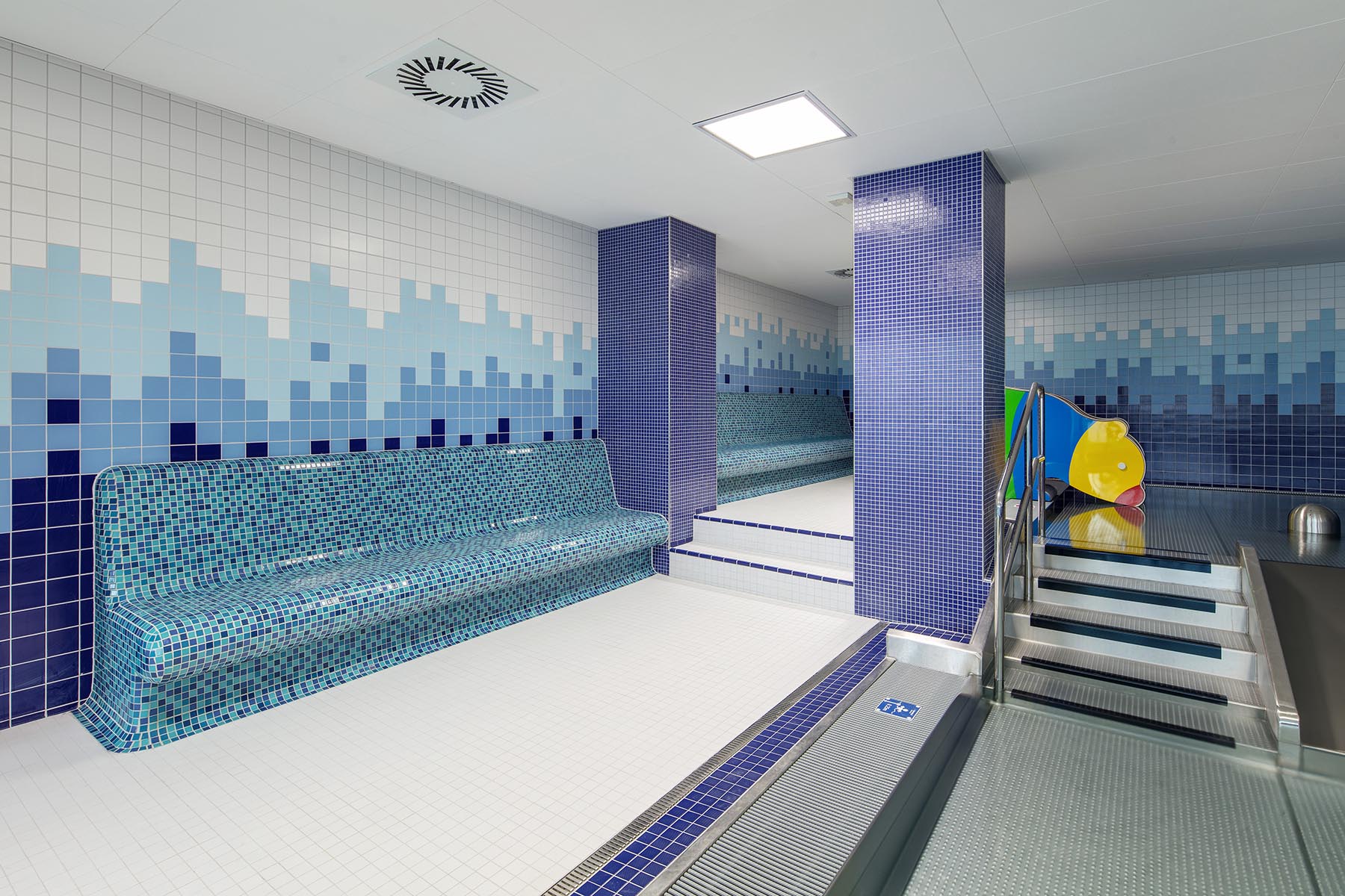keramická mozaika zdobí také sloupy a lavice v hale s dětským bazénem.
