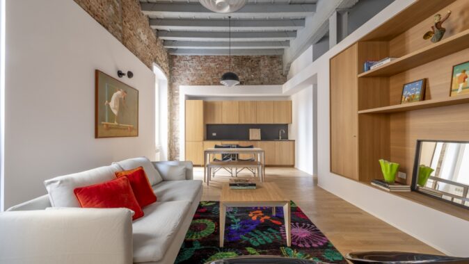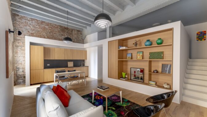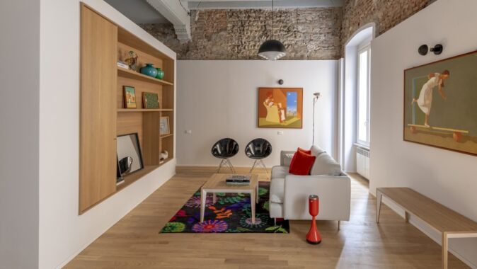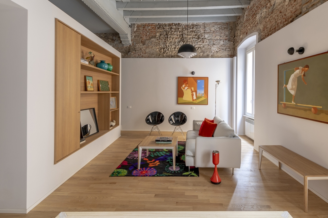 Dva prostorné moderní byty vznikly radikální rekonstrukcí zchátralých interiérů historického paláce v italském městě Brescia. Byty mají shodný půdorysný tvar, nacházejí se totiž v podlažích přímo nad sebou. Kvůli rozdílu ve světlé výšce však bylo třeba najít pro ně odpovídající individuální architektonická řešení. Prostor Mezonetu v pianu nobile, ve druhém nadzemním podlaží, využívá vertikální aspekt s výškou stropu 4,4 metru. Byt se zaoblenou stěnou, který se nachází ve třetím nadzemním podlaží, naopak více pracuje s horizontálním směrem a místnosti odděluje sníženými příčkami.