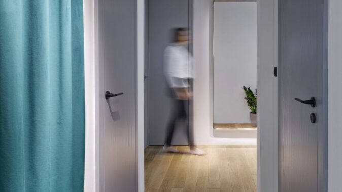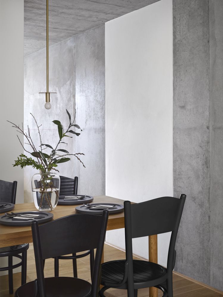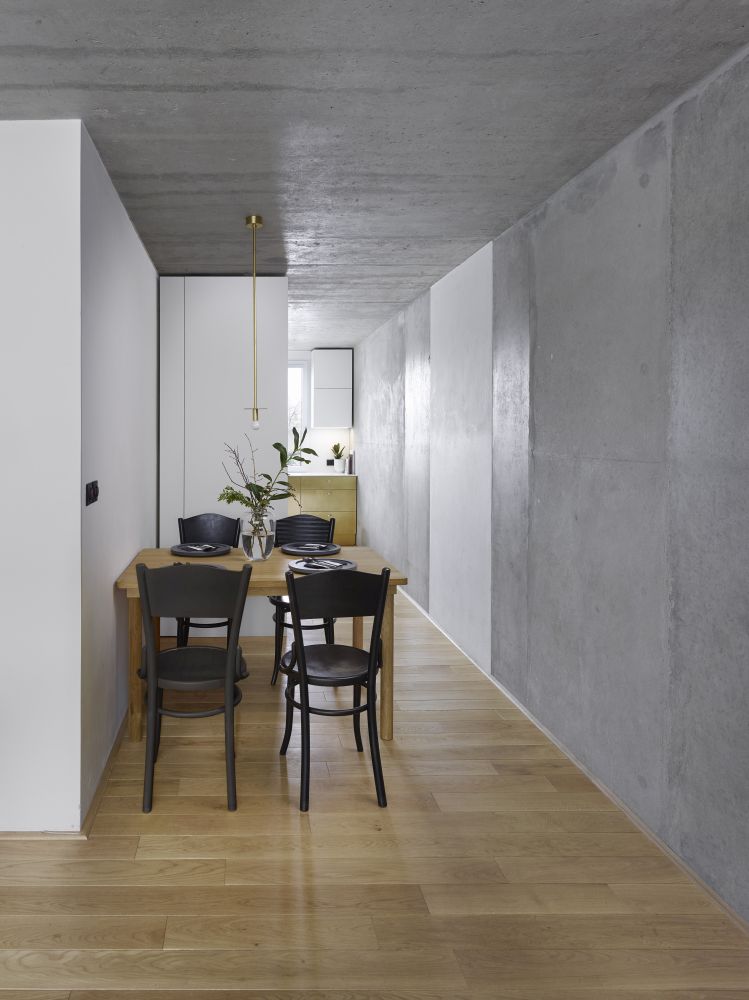 Po několika variantách otevření prostoru jsme dospěli k závěru, že domácnost s dvěma chlapci potřebuje oddělné pokoje a klid za uzavřenými dveřmi. Otevřeli jsme tedy obývací pokoj s jídelnou a kuchyní jako jednu část bytu a chodbu s ložnicemi, koupelnou a toaletou jsme oddělili dveřmi s bočními světlíky. Z dispozice 4+1 jsme tak udělali 4+kk. Každá ložnice má velkou vestavnou šatní skříň. Protože v bytě není komora, umožnilo toto řešení minimum volného nábytku, který by zatěžoval prostor.