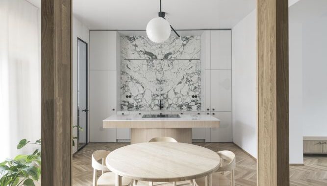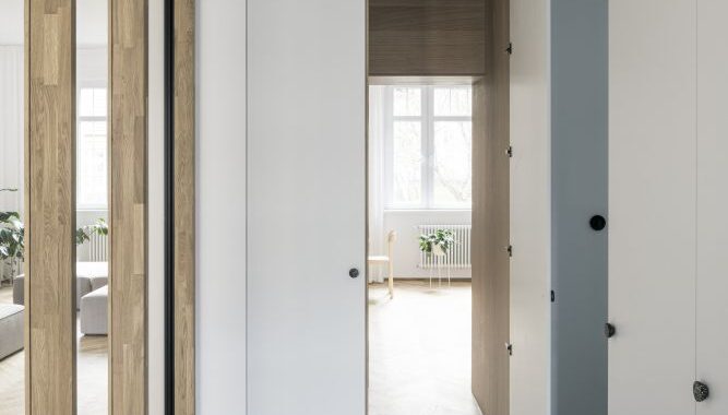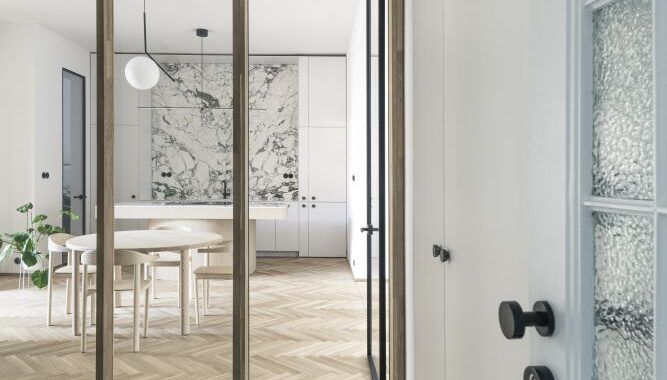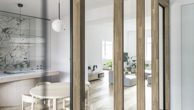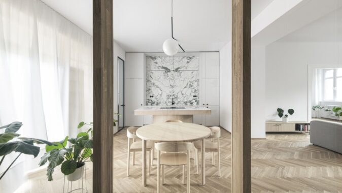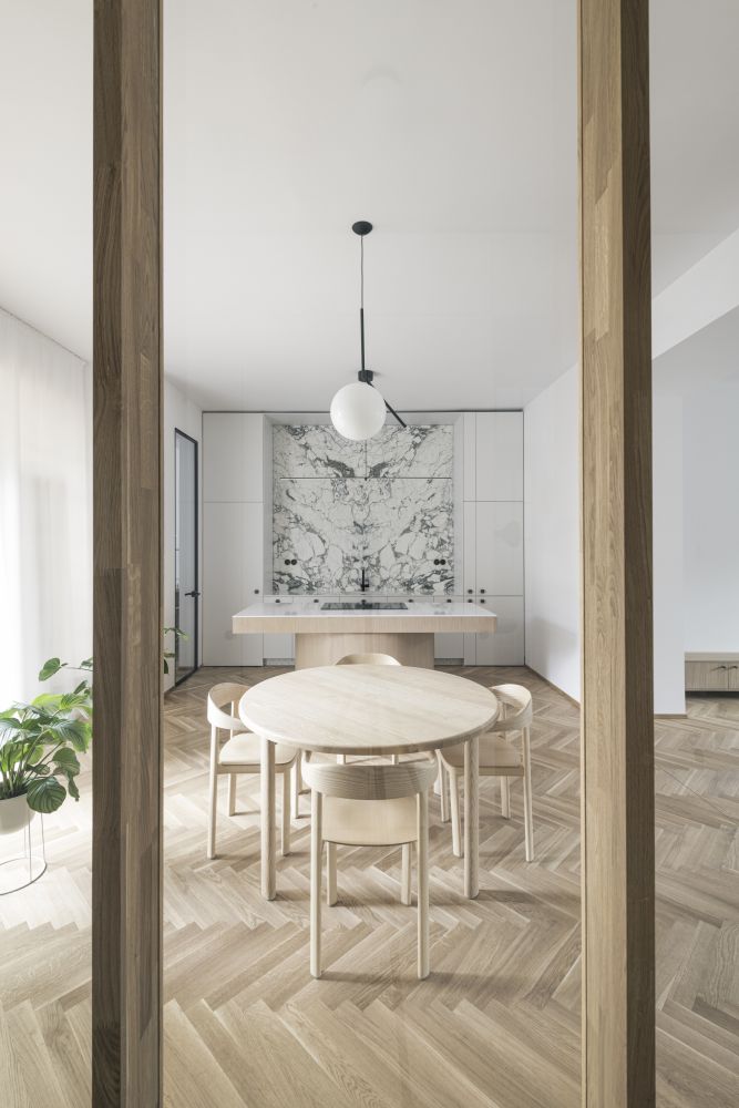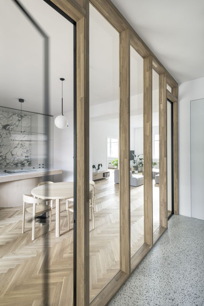 Prostorové řešení, osazení otvorů a proporce respektují symetrické schéma bytu. Kuchyni jsme přesunuli k jídelně tak, aby vznikl plnohodnotný vstupní prostor, propojený s obývacím pokojem prosklenou stěnou.
