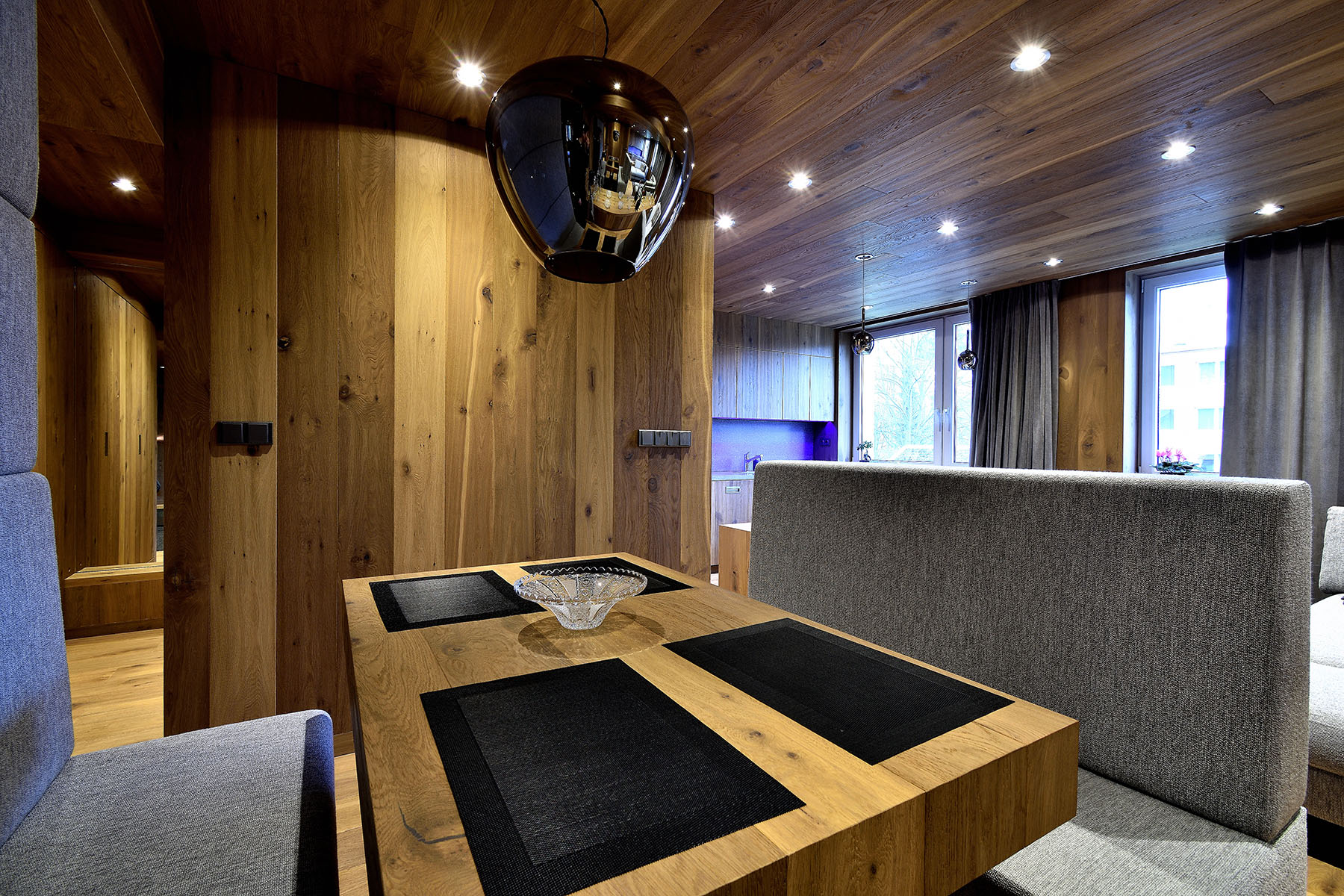 V luxusní horskou chalet hodnou alpských letovisek proměnil architekt Milan Jirouš interiér tuctového panelákového bytu v Krkonoších. Základem materiálového minimalismu se stalo dřevo, konkrétně dubové podlahové krytiny Kährs, doplněné sklem a textilním čalouněním. Puristické pojetí interiéru díky originálnímu využití dřeva a dalším promyšleným detailům (televize zabudovaná v zádech čalounění jídelní lavice, zrcadla opticky násobící prostor atd.) vytvořilo dokonale útulné bydlení, lákavé snad pro všechny lidské smysly – úchvatné na pohled, přirozené na dotek, poklidné, vonící.