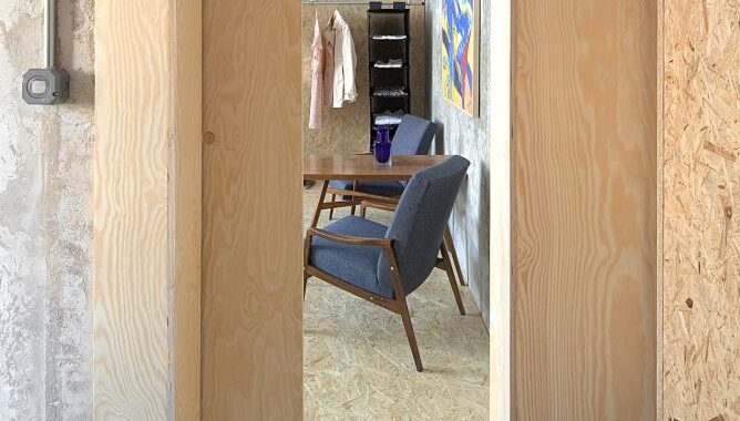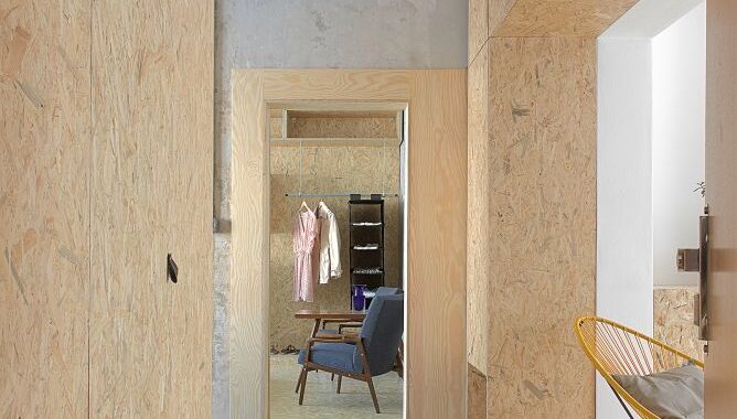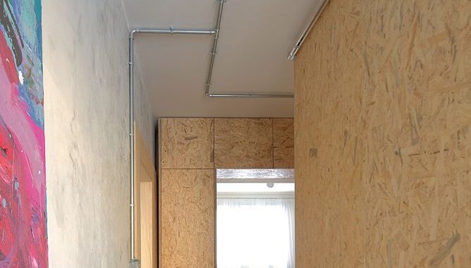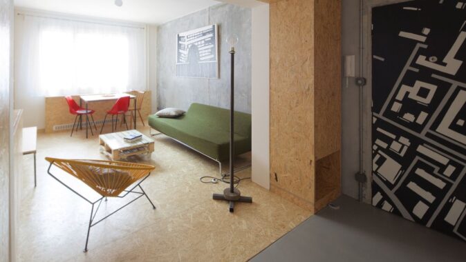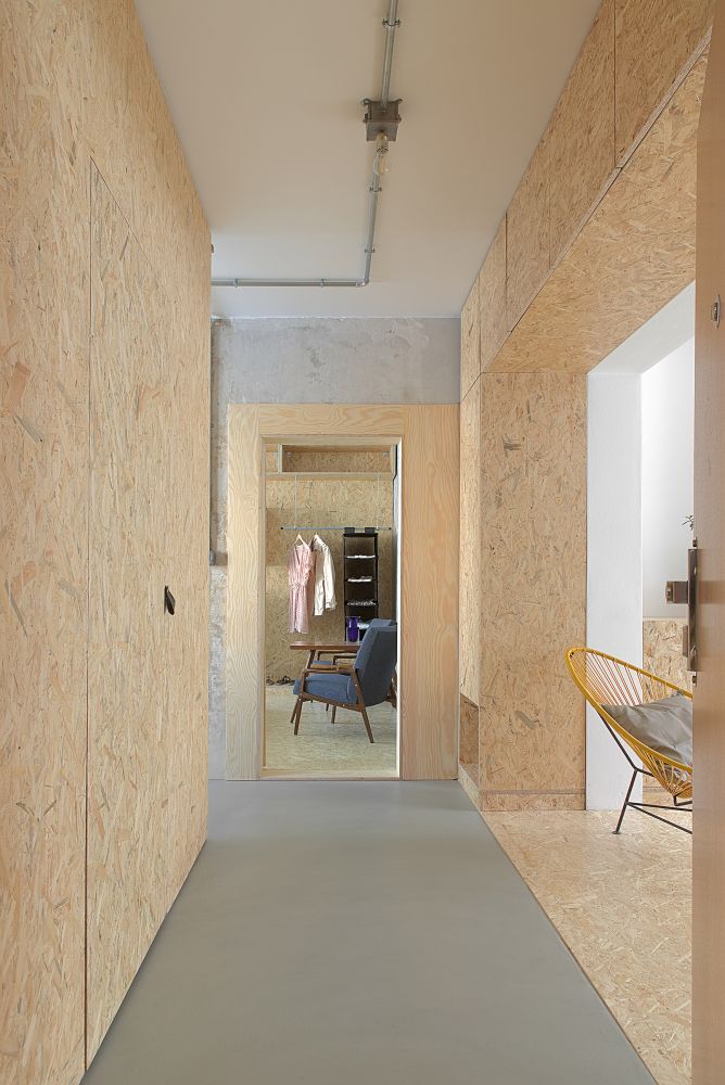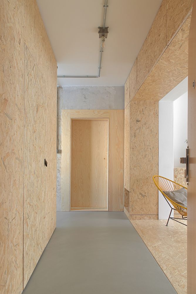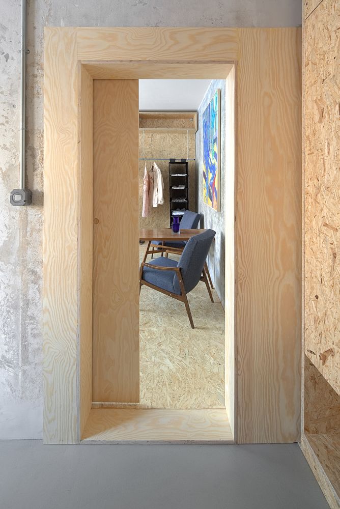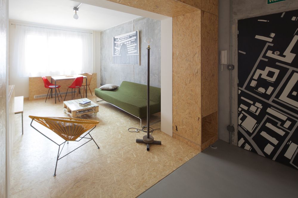 Zděné příčkovky jsme vybourali, stejně tak betonovou příčku oddělující obývací prostor, ta musela být nahrazena rámem z důvodu rizika prasklin příček ve vyšších patrech. Stěny i stropy jsme zbavili několika vrstev maleb. Zůstal holý beton v horší kvalitě, než jsme očekávali. Do vzniklého prostoru po demolici jsme vložili objem nové sprchy a záchodu, kterým jsme nahradili původní oddělené prostory. Příčky jsou běžné z porobetonových tvárnic, z vnější strany obložené lakovanými OSB deskami.