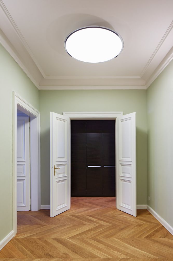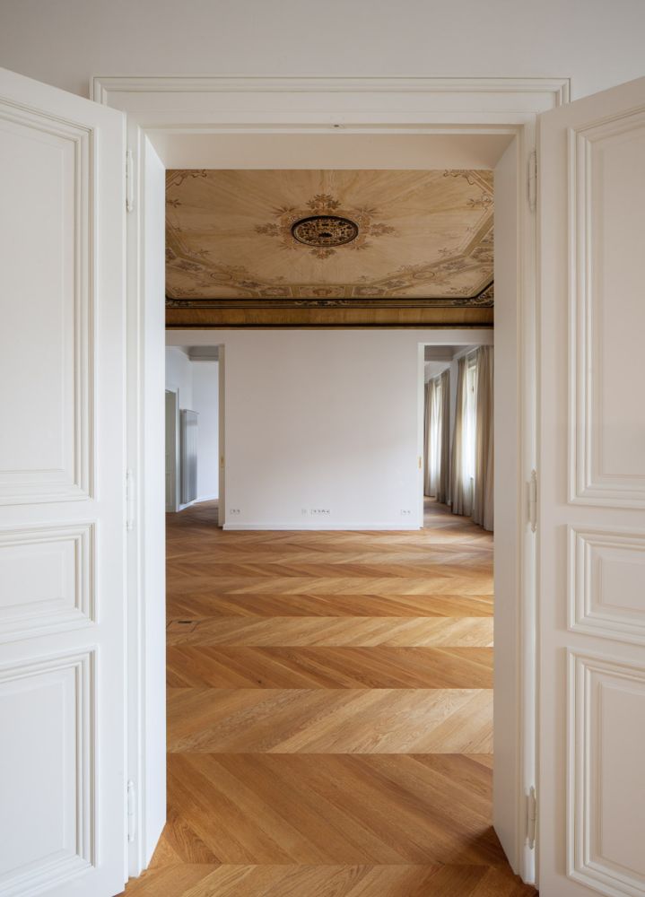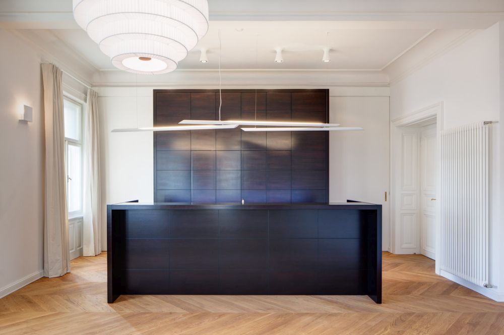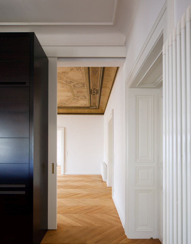 Dispozice je více prostorově otevřena a provozně propojena. Typologicky je byt změněn na 4+kk, přičemž kuchyně a jídelna tvoří jeden spojitý prostor. Původně úzké obytné místnosti byly sloučeny. S ohledem na velikost bytu byla nově vytvořena klasická vstupní hala středního traktu. Do nárožní pozice s výhledem a balkonem je nově situována zvětšená jídelna. Pobytové místnosti byly propojeny při jižní fasádě i středové stěně. Tyto průchody lze uzavírat skrytými deskovými posuvy. Z haly je posílen hlavní nástup dvojicí dvoukřídlých dveří. Vytvořili jsme také oddělitelnou hostovskou sekci dvorního traktu, od denní části je odstíněna vstupní halou. Dispozice tedy byla doplněna o pokoj pro hosty s vlastní koupelnou a šatnou, který vznikl sloučením místností do dvora. Mezi privátní a hostovskou sekcí bylo navrženo toboustranně uzavíratelné propojení. Jako clona mezi uličním a dvorním traktem je vložen dělicí blok vybavenosti bytu (koupelna, technická místnost). Kuchyň je řešena jako soliterní nábytkový objekt. Spolu s ostatním nábytkovým vybavením tvoří protiváhu dobovému pojetí konstrukcí, výplní a povrchů. U kuchyně  klient předpokládá limitované využití, proto  bylo možné ji opticky skrýt a integrovat. Zcela přiznaný je snídaňový bar, oddělující jídelnu.