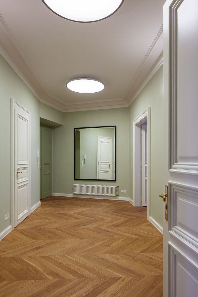 Návrh propojuje dva sousedící byty v činžovním domě z konce 19. století. Řešil změny dispozic, dělicích svislých konstrukcí, technických instalací, finálních povrchů, hrubých konstrukcí podlah a interiérového vybavení. Klient si přál zpracovat projekt pouze do úrovně vytvoření částečně vybavené pronajímatelné jednotky.