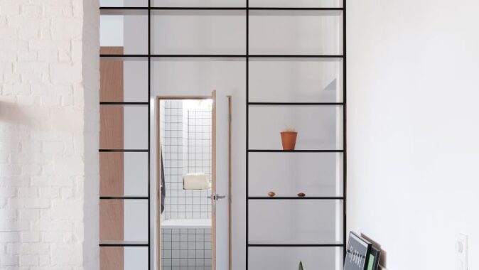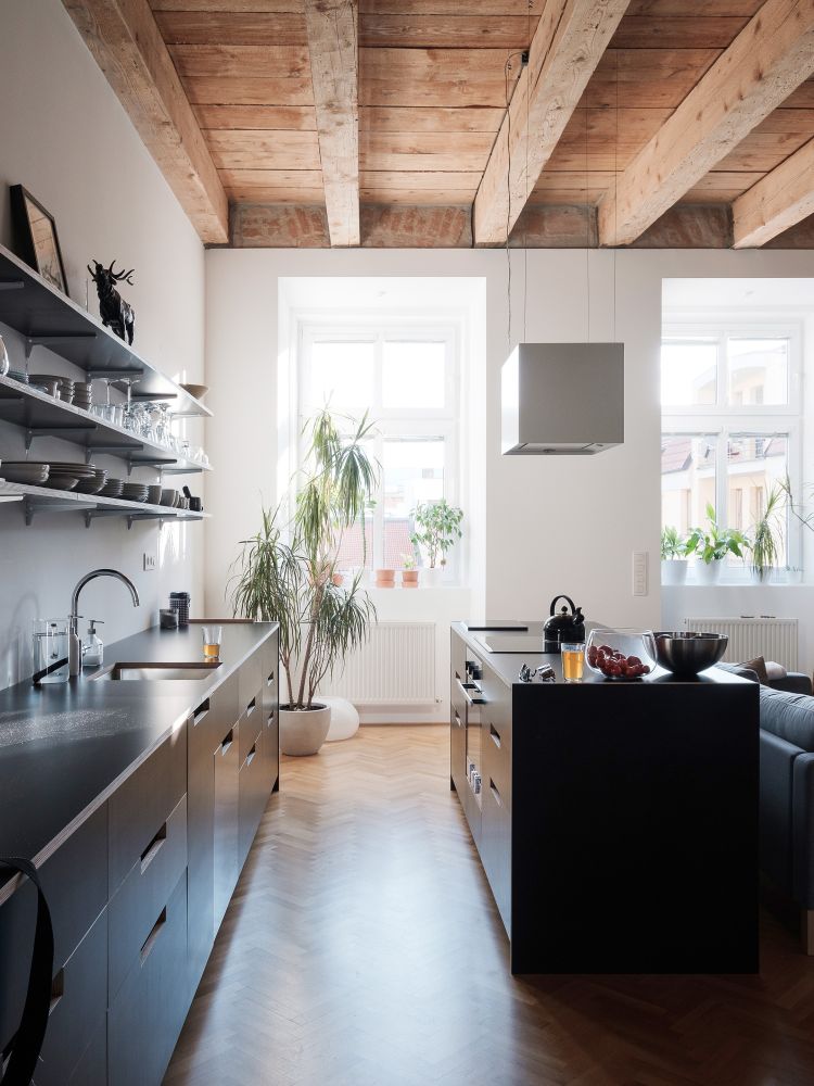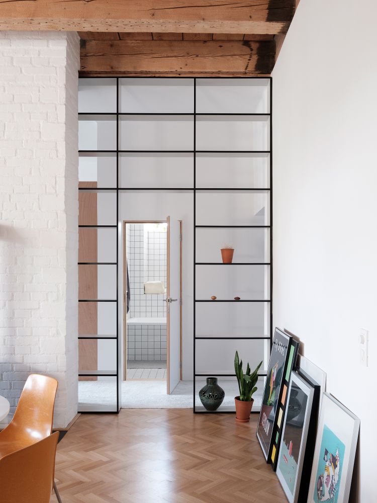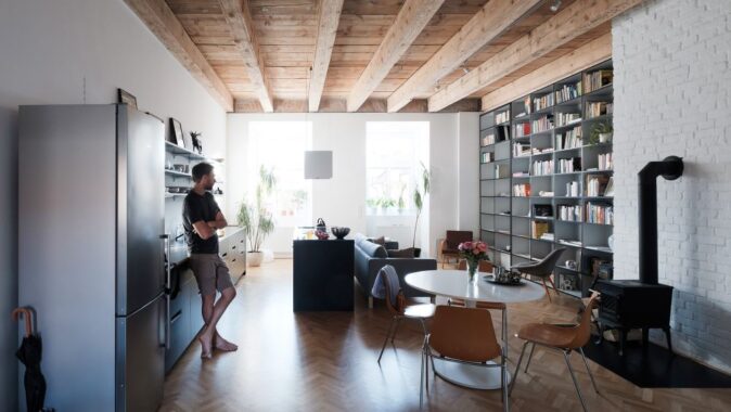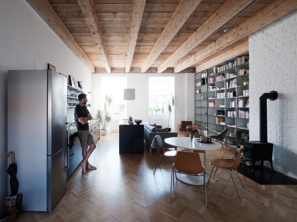 Byt má slúžiť mladému bezdetnému páru. Dispozícii dominuje spoločenská miestnosť s monumentálnou svetlou výškou 3,6m. V druhom pláne, za knižnicou sa nachádza nočná časť so samostatnou hygienou a šatníkom. Z naznačenej vstupnej halu je prístupná ešte jedna spálňa a hygiena. Vstavaný nábytok je pripravený tak, aby po malom zásahu transformoval byt aj pre účely rodiny s deťmi.