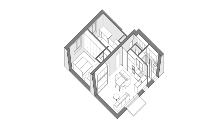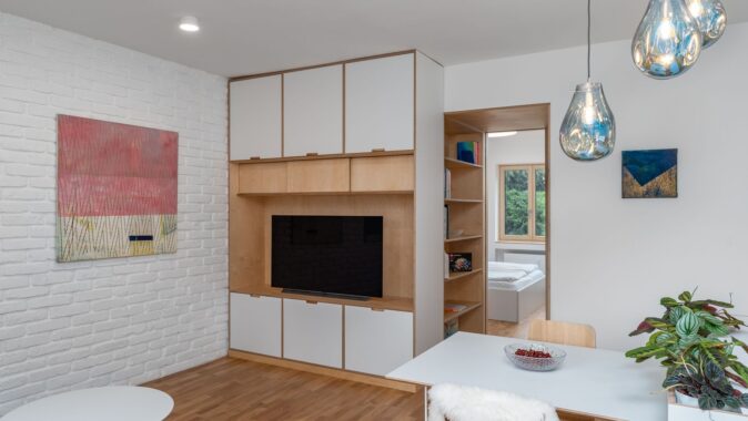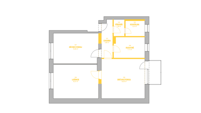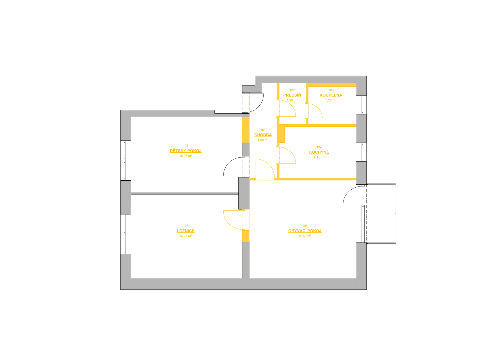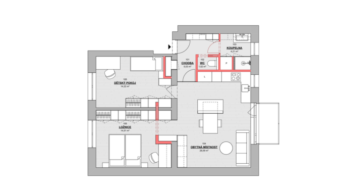 dispozice, kdy z původního bytu 3+1 vznikl vzdušnější 3+kk. Bylo také nutné