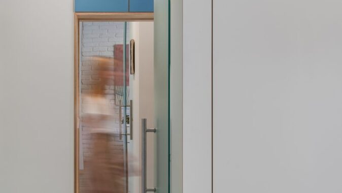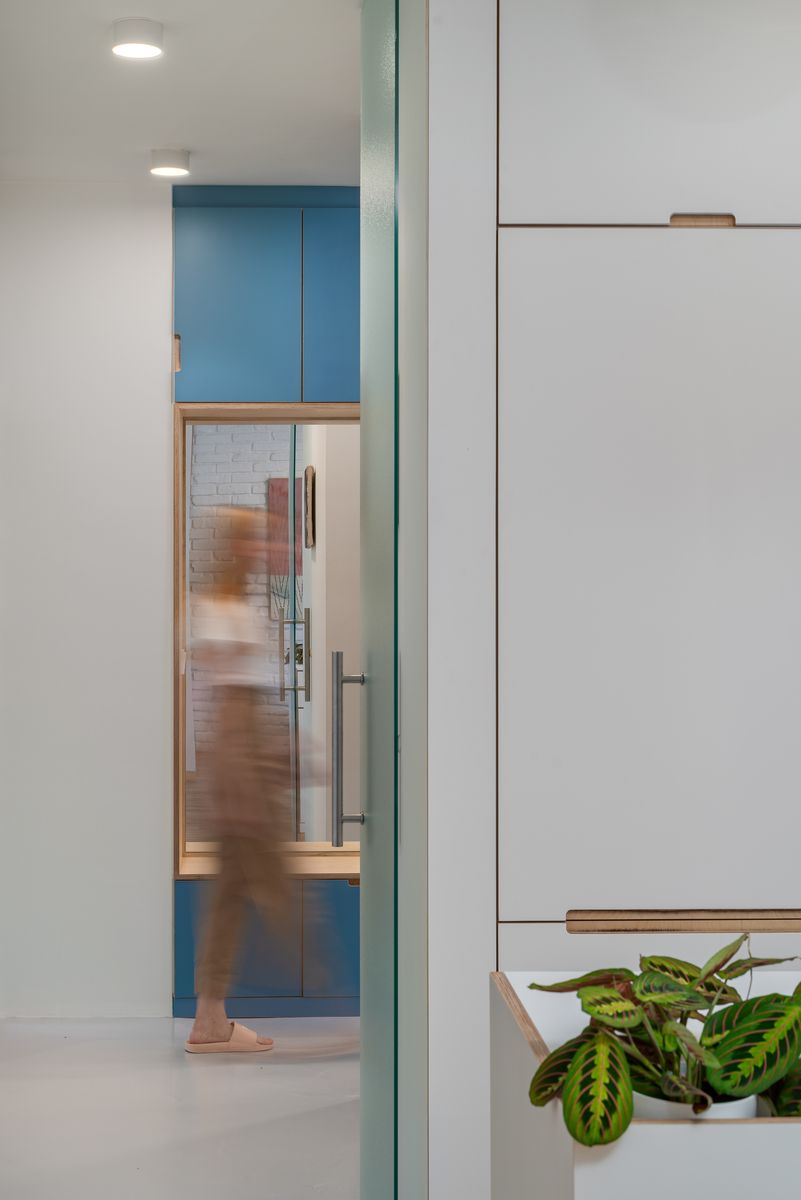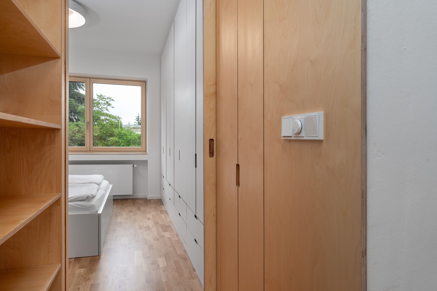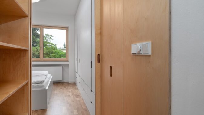 jako vestavěné skříně, které průběžně lemují stěny v celém bytě, sjednocení