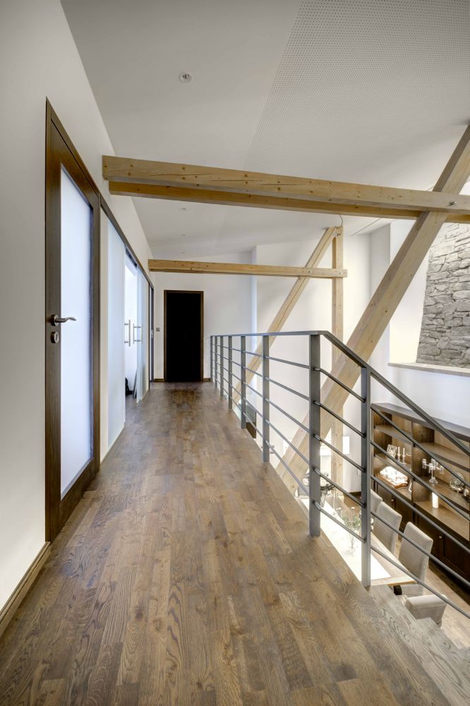 Nosné konstrukce byly v dobrém stavu, opravovali jsme jen trámový strop nad 1. NP. V přízemí jsme vzhledem ke zvýšené vlhkosti ve zdivu navrhli sanační omítky a v 2. NP je z tohoto důvodu sádrokartonová předstěna, za níž je provětrávaná vzduchová mezera. Podlahy v přízemí mají podle doporučení malý difuzní odpor, není zde tedy navržena hydroizolace a okolo stěn je kanálek pro přerušení kapilárního vzlínání vlhkosti z podlahy do stěny.  Rovněž původní kamenná opěrná stěna svahu, která se stala dominantou interiéru, zůstala bez dalších hydroizolačních zásahů.