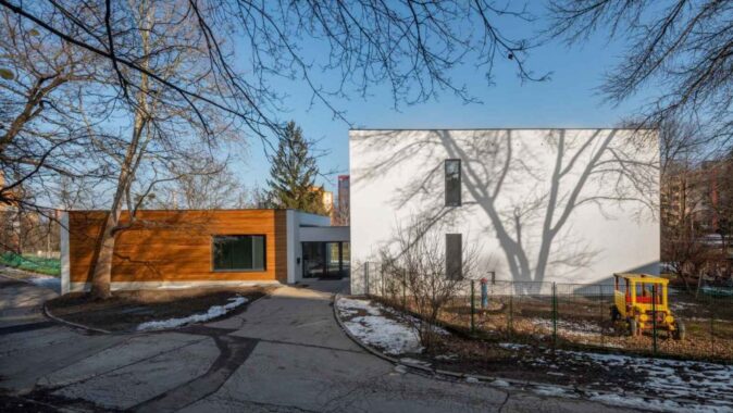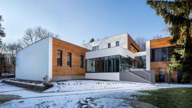 Architektonický výraz návrhu vycházel z původního charakteru stavby. Jedná se o pavilonový princip výstavby doplněný o propojovací komunikační krček. Snažili jsme se o návrat k jednoduchému řešení s použitím dřevěné fasády. Objekt s přírodními prvky a vzrostlou zelení, v blízkosti potoka, navazuje na historii dřevěných staveb v tomto místě. Navrhli jsme velkorysé prosklení s výhledy do okolí, obnovili jsme pásová okna, otevřeli vnitřní atrium a také odstranili přední oplocení zahrady.