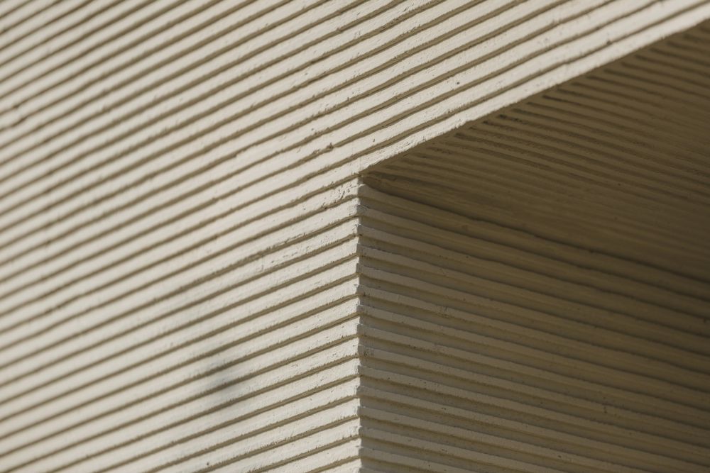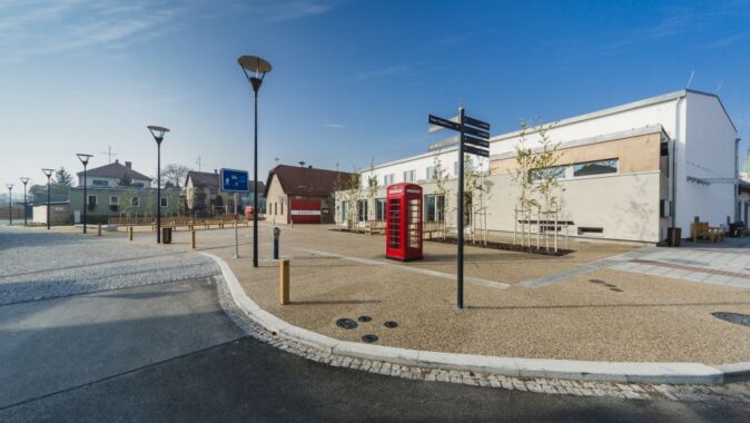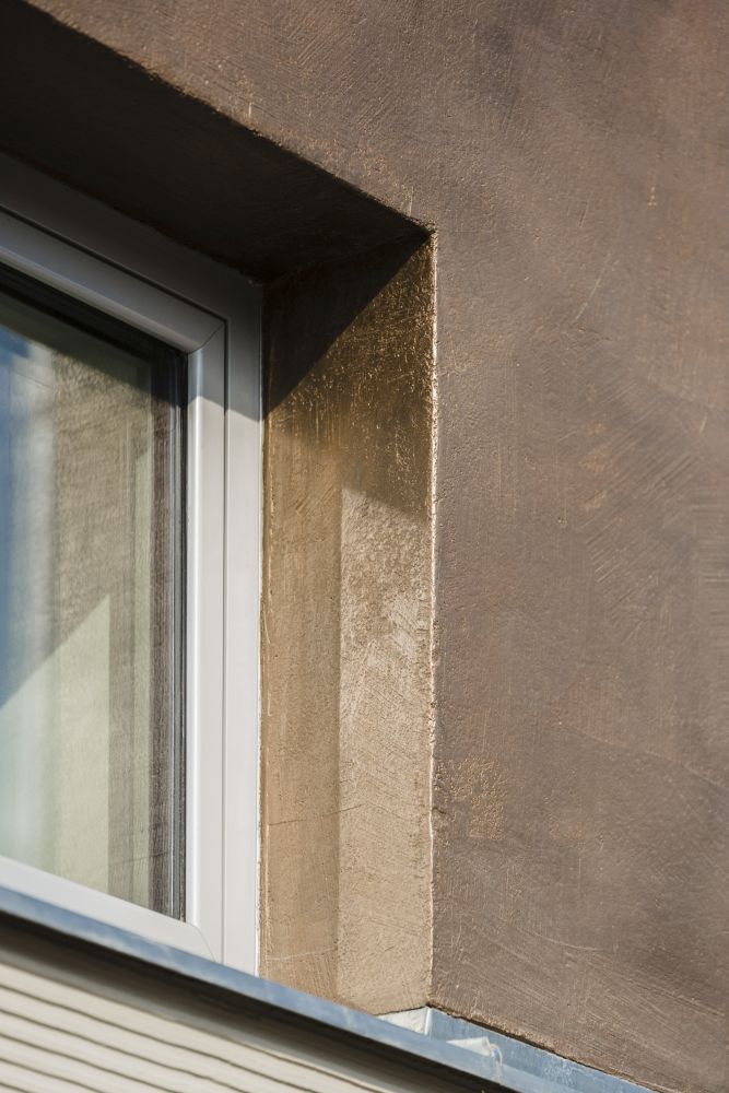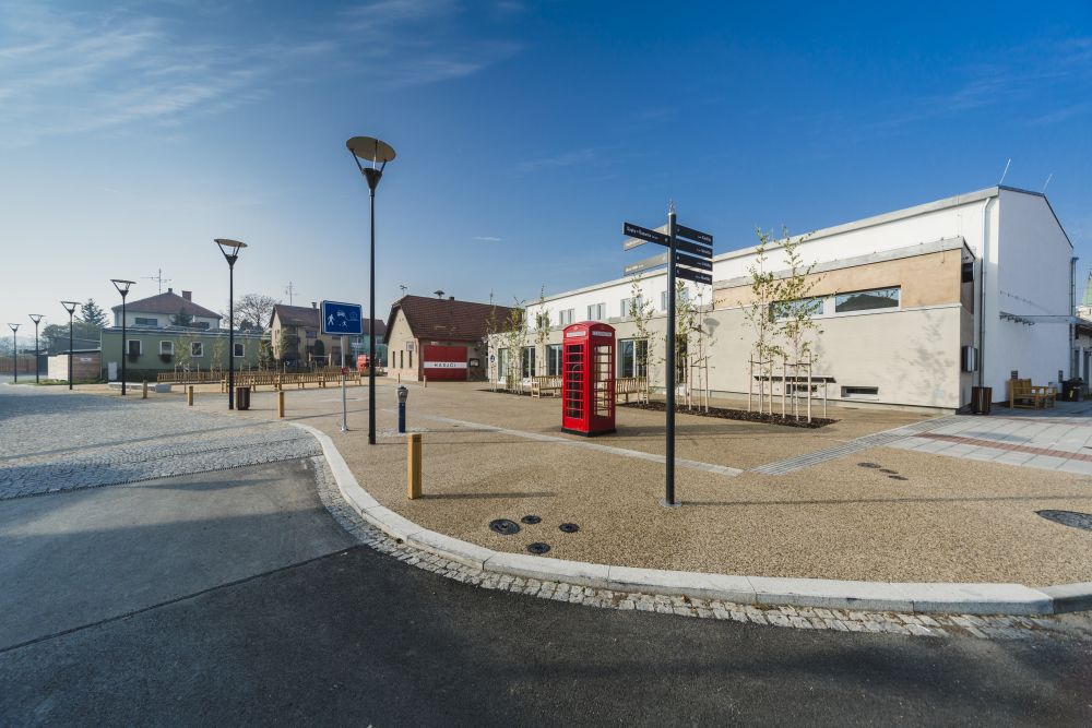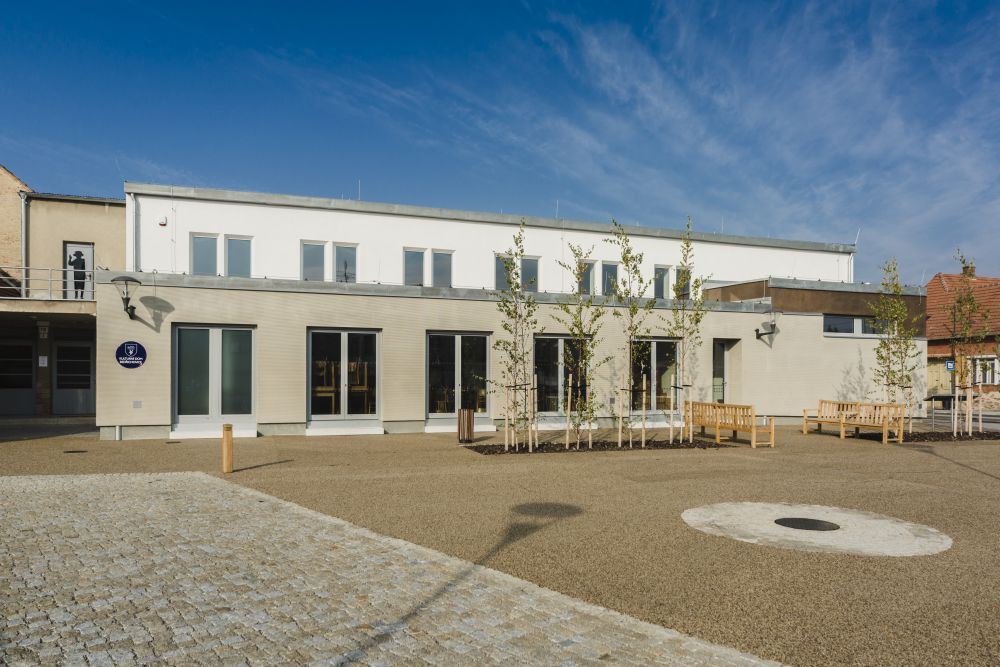 Architektonický návrh exteriéru je jednoduchý – k hlavní bílé hmotě sálu jsme přidali šedou hmotu přísálí, opatřenou horizontálně pruhovanou omítkou probarvenou ve hmotě. Bílá omítka hlavního objemu má nahodile provedenou jemnou strukturu, která kontrastuje s geometrickou horizontální strukturou omítky přísálí. Právě ruční nepravidelnost a jemná struktura bílé omítky má být jedním z pojítek se starým duchem vesnice. Sokl byl realizován v imitaci betonu omítkovou stěrkou. Všechna okna a dveře jsou nová. Fasáda do náměstí díky novým oknům otevíravým až k zemi dostala novou kvalitu, odpovídající funkci objektu. Okna se dají otevřít a společenský život na náměstí lze spojit s životem uvnitř domu.