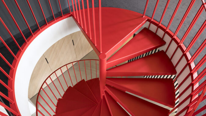 neutrální barevná škála je oživena výraznými akcenty červené barvy.
