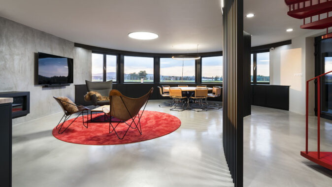 použitých materiálů podporuje industriální charakter celého objektu a jejich