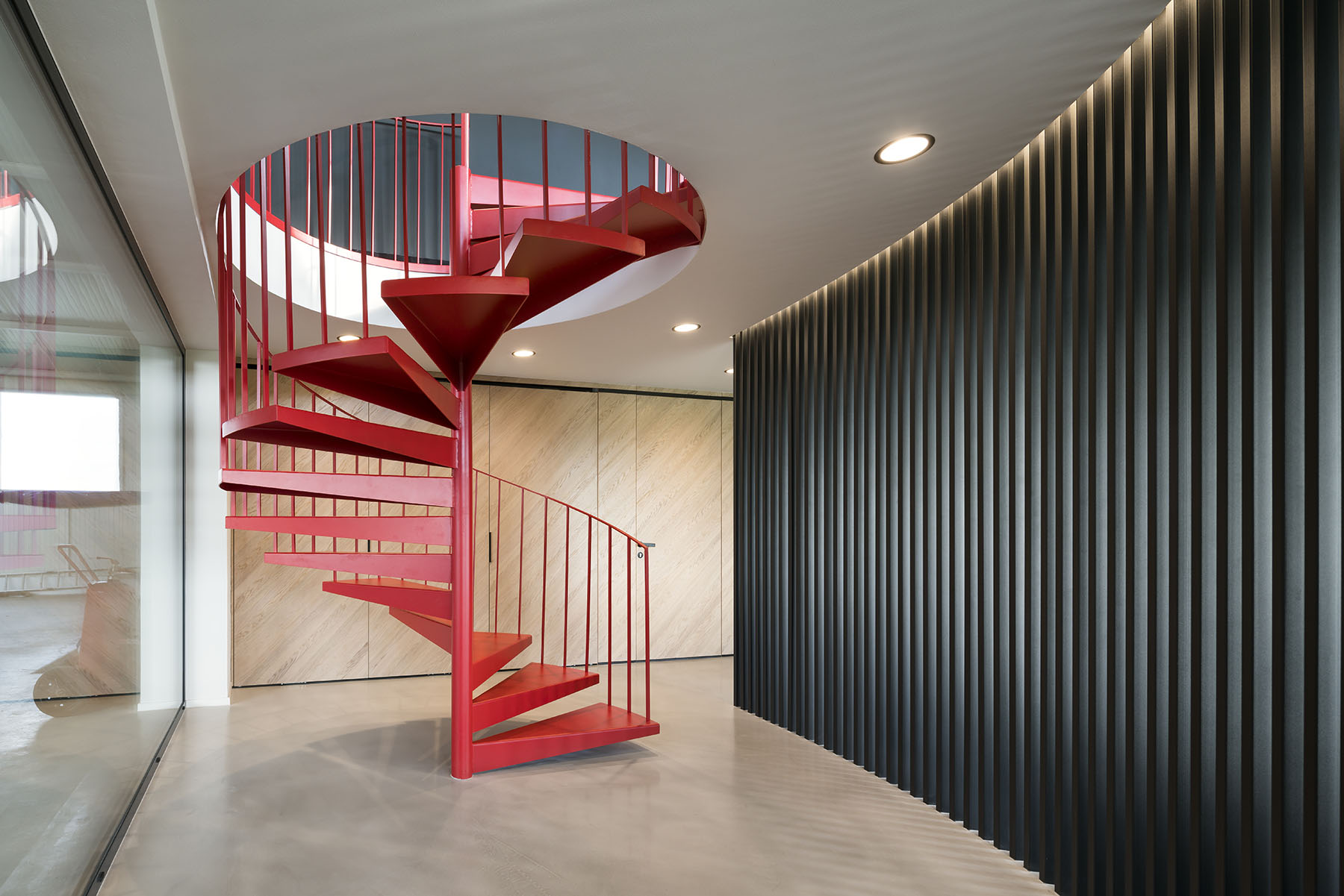 ocelové schodiště v kombinaci s lamelovou příčkou tvoří transparentní zádveří,