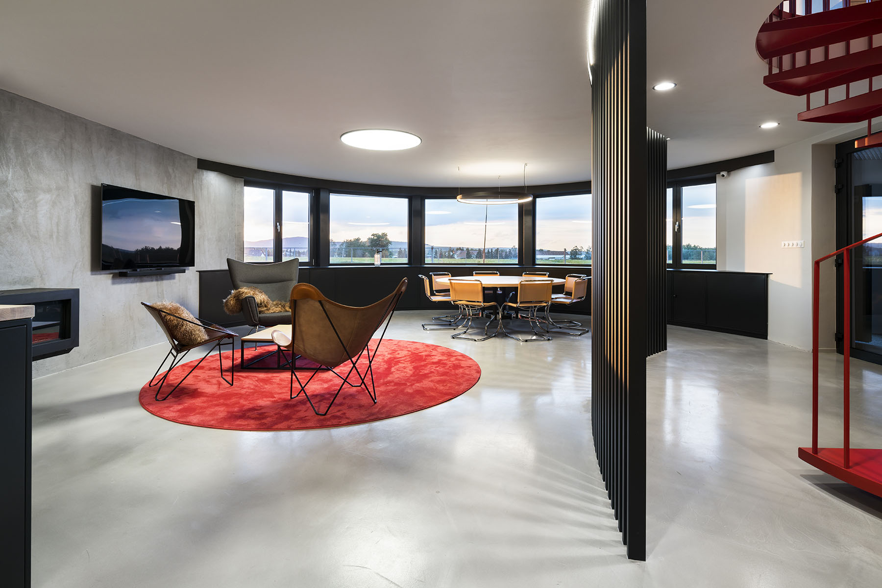 použitých materiálů podporuje industriální charakter celého objektu a jejich