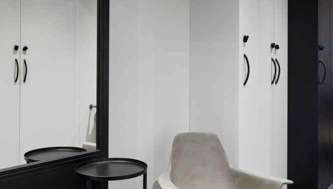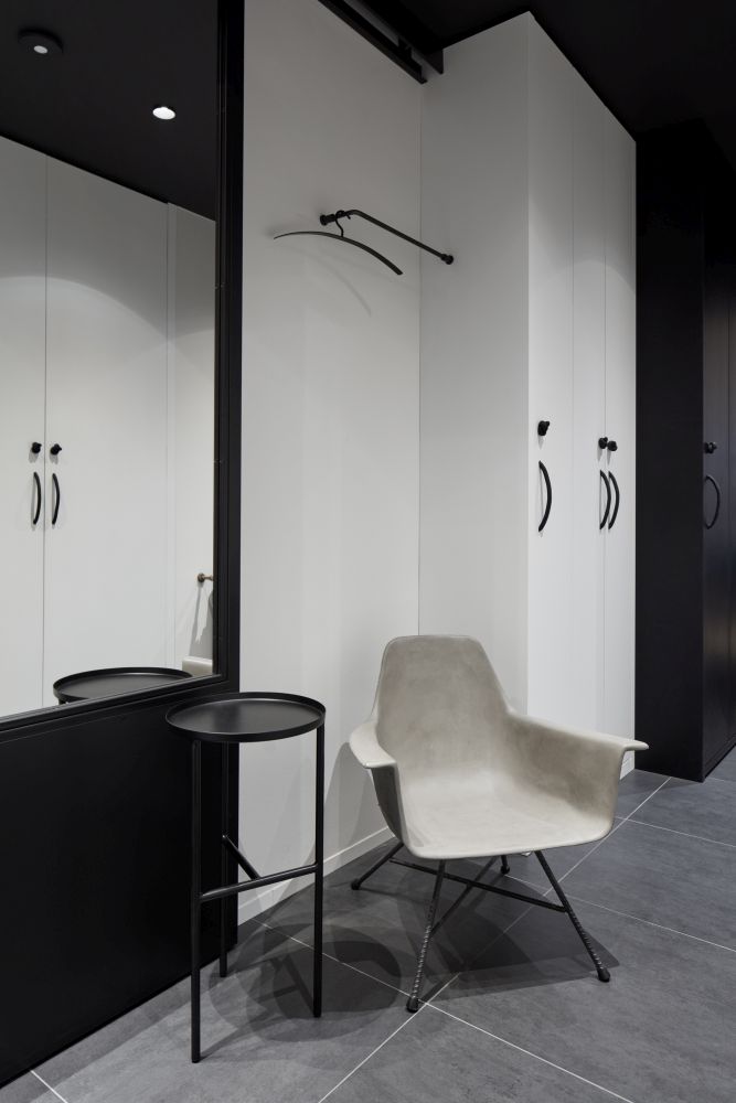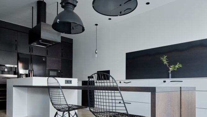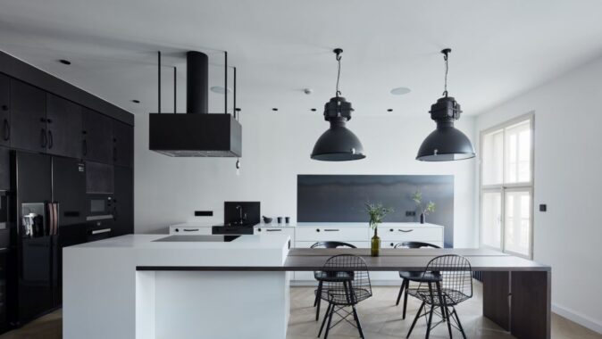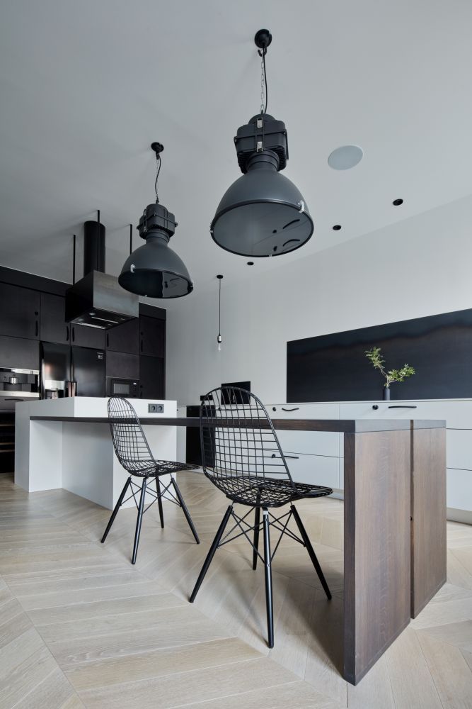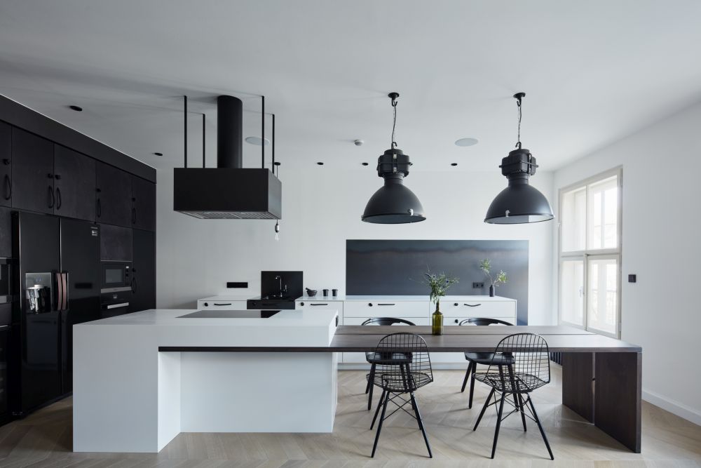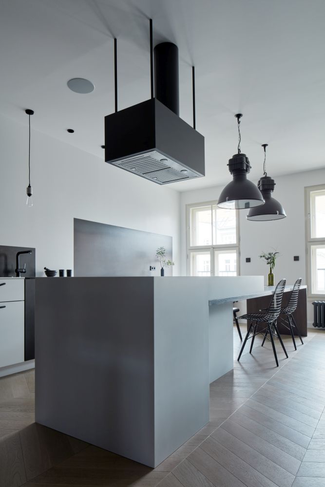Byt se nachází v nově zrekonstruovaném domě v blízkosti Letenského náměstí. Dispozici navrženou developerem jsme upravili na míru požadavkům mladého páru. Byt s malým balkonkem má rozlohu 98 m2, patří k němu i parkovací stání řešené zakladači. Od developera byl předán ve stavu shell and core, což je ideální stav pro návrh i samotnou realizaci. Přesto jsme se nevyhnuli stavebním úpravám vyplývajícím z nově navržené dispozice – rozvody elektroinstalací, úpravy a změny pozic stavebních otvorů, rozvody vody a odpadů, nový sádrokartonový strop.