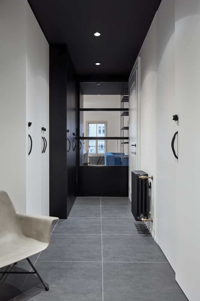 Bytu jsme chtěli částečně navrátit původní charakter, který byl daný už jen špaletovými okny. Dveře jsme proto zvolili obložkové profilované a na míru, které jsme oproti původnímu návrhu zvýšili. Podlaha je v obytných místnostech dřevěná a parkety, které jsme zvolili v atypicky větším rozměru, jsou skládány ve francouzském stylu. Záměrem bylo původní prvky kombinovat s industriálními a barevnými detaily. Jednotná linka bytu se prolíná v modré barvě, kterou jsme použili například v malbě na cihlové stěně v obývacím pokoji, na sedací soupravě, v modré mozaice v koupelně kolem vany, ale také na dveřích do soukromé koupelny v ložnici. Industriální prvky se pak opakují v kovu, který je využit v různých podobách: posuvné dveře oddělující vstup od obytného prostoru, knihovna z roxorových prutů nebo plech za kuchyňskou linkou. Velkou váhu jsme také dali na výběr topení – litinová tělesa doplněná o retro černé ventily. Celý interiér je laděn jako celek včetně vybraných doplňků a dekorací.