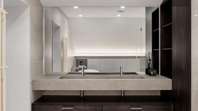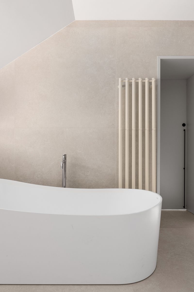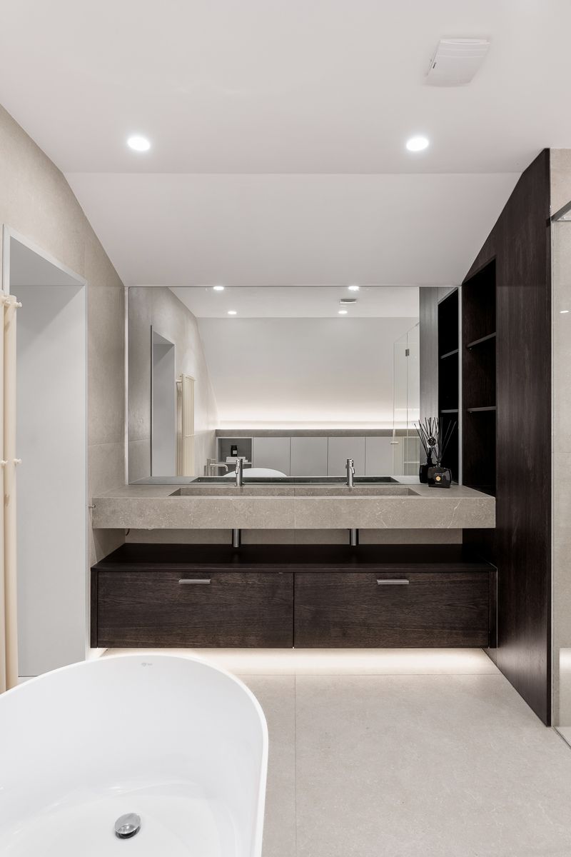 Byt disponuje třemi plnohodnotnými koupelnami a jednou samostatnou toaletou u obývací části. Všechny prostory hygienického zázemí jsou navrženy v obdobných barevných tónech jako celý interiér. Koupelnám dominuje krémový velkoformátový obklad s dekorem pískovce v kombinaci s truhlářsky řešenými skříňkami z tmavě mořené dubové dýhy. Velkoformátové zrcadla v dětské a v hlavní koupelně opticky prostory zvětšují.