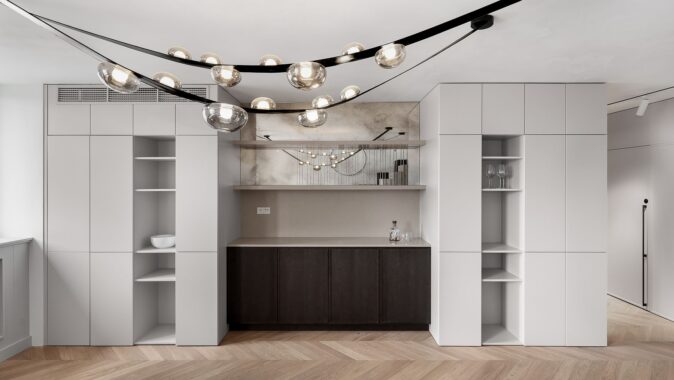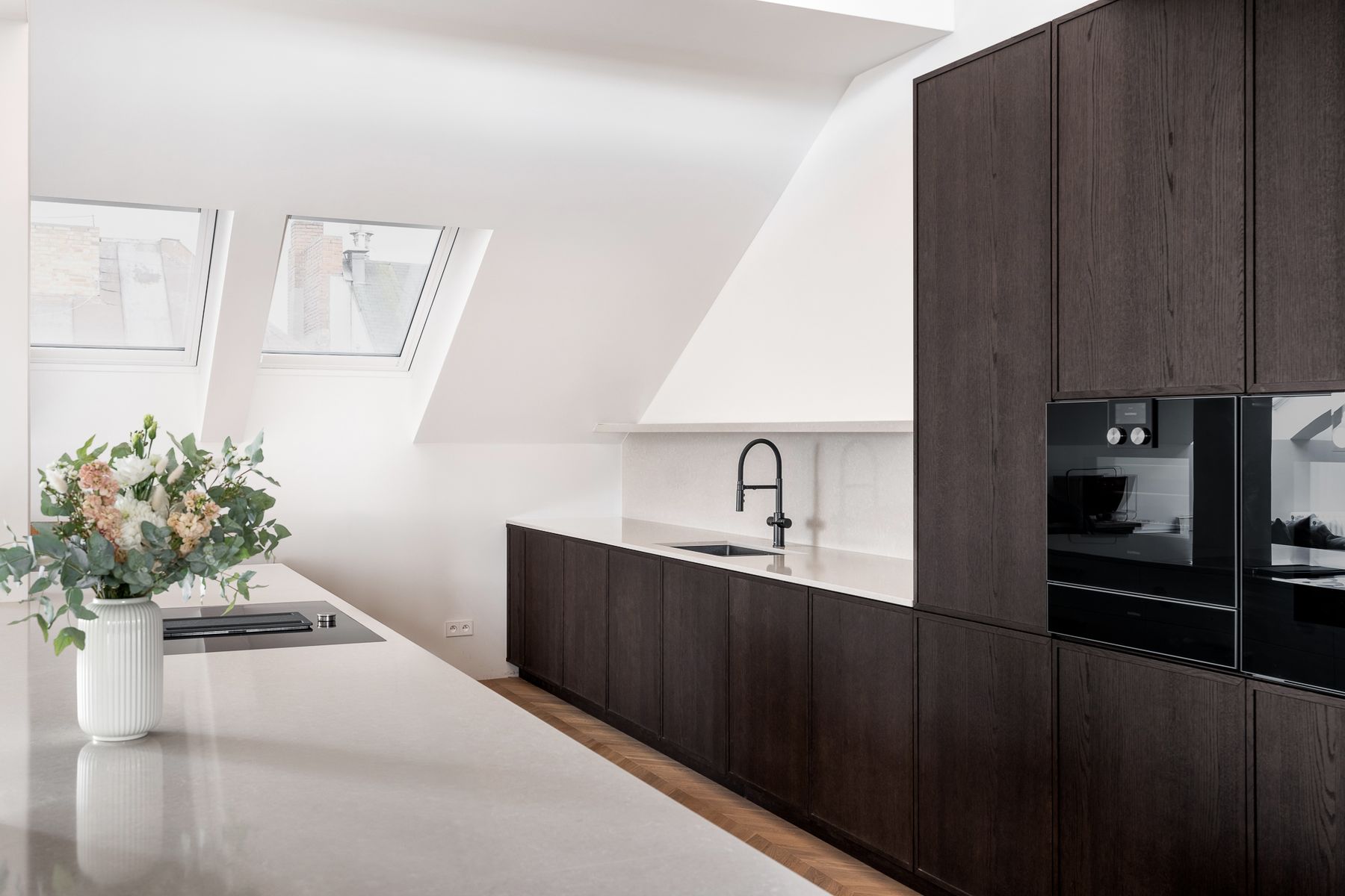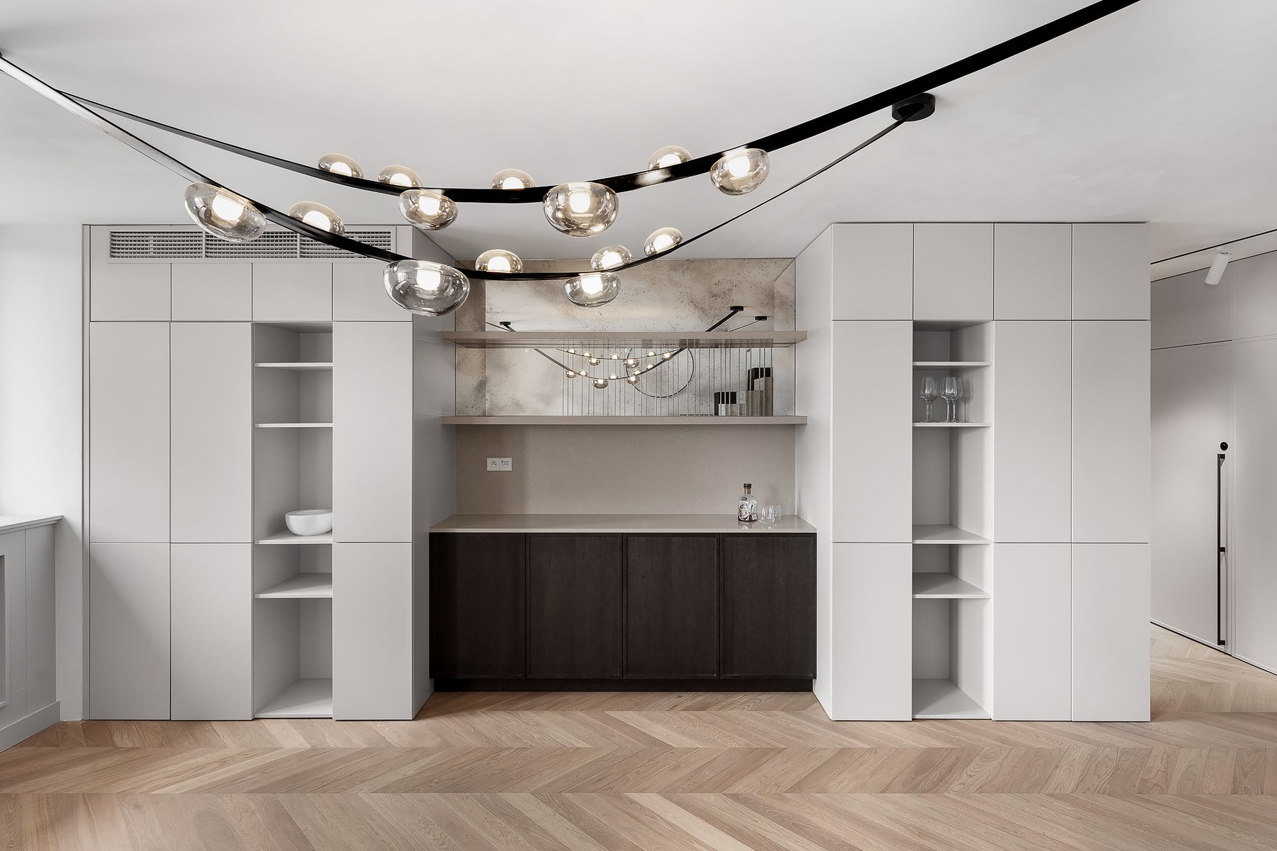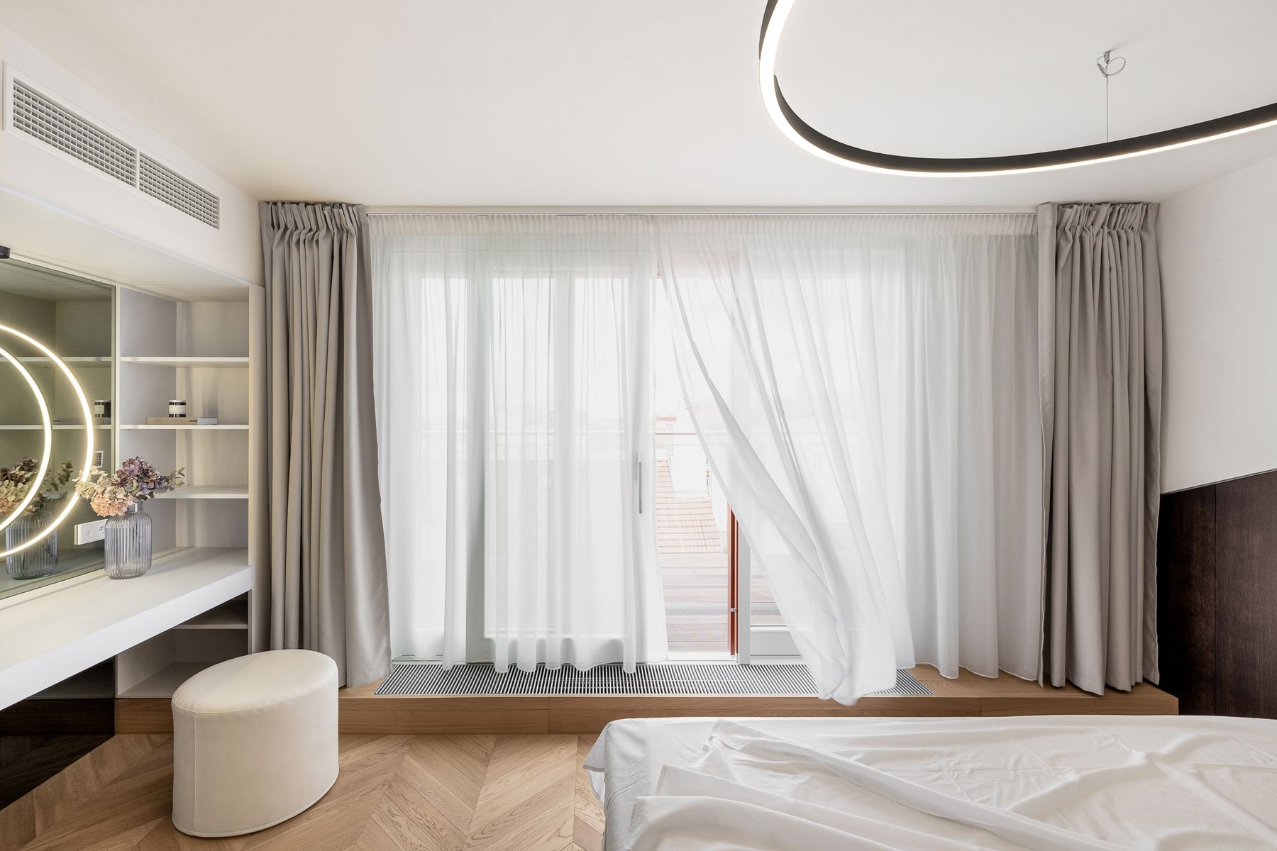 Na velkorysých 307 m2 najdete vše, co pro rodinný život v centru metropole člověk potřebuje. Funkce bytu primárně odlišuje dvoupatrové členění. Zatímco dolní patro slouží ke společnému životu, návštěvám a pro děti, horní patro nabízí jeho obyvatelům intimitu a soukromí.