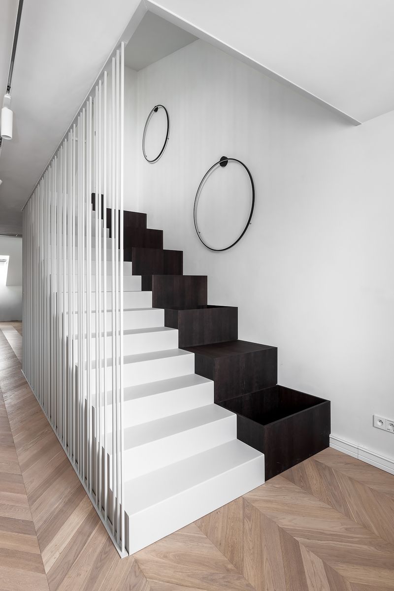 Důležitý bod v rámci rekonstrukce představovala hra se světlem. Vzhledem k tomu, že směrem do ulice nebylo možné byt jakkoliv prosvětlit, zvolili architekti světlé, krémové tóny v rámci celého interiéru. To jim zároveň dalo prostor využít tmavé tóny pro architektonické zdůraznění důležitých prvků. Příklad můžeme hledat v případě kuchyňské linky nebo v rámci řešení schodiště. Díky hře s barvami a rozměry vzniklo atypické schodiště, které poutá pozornost příchozích návštěv.
