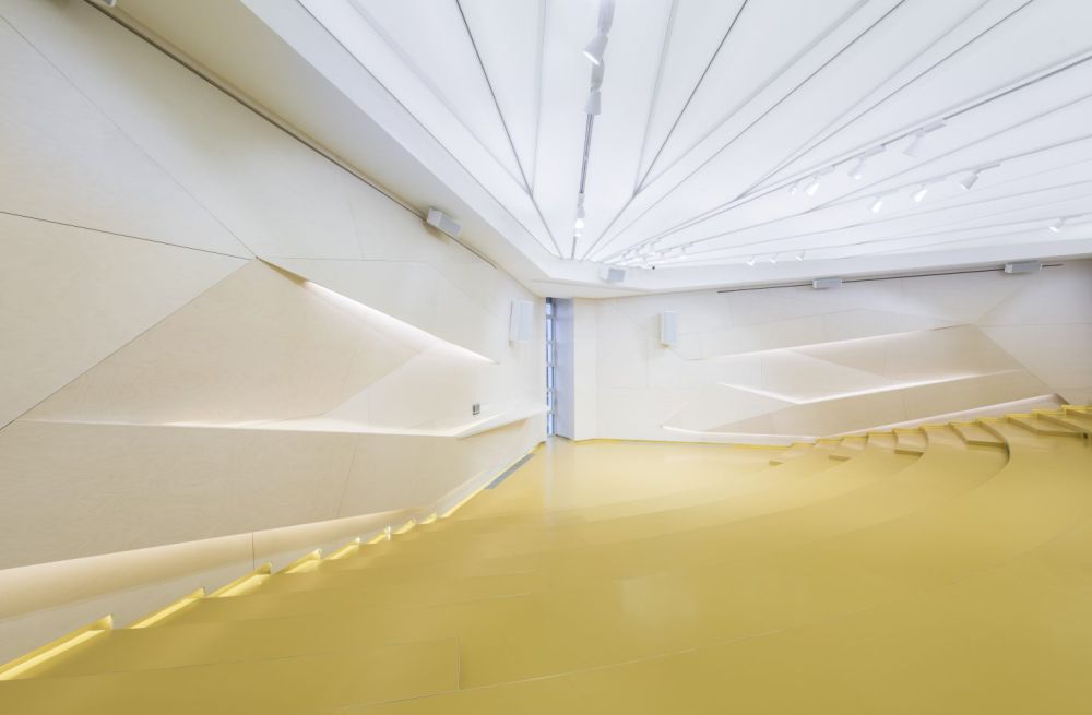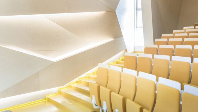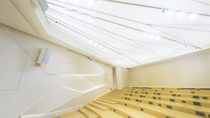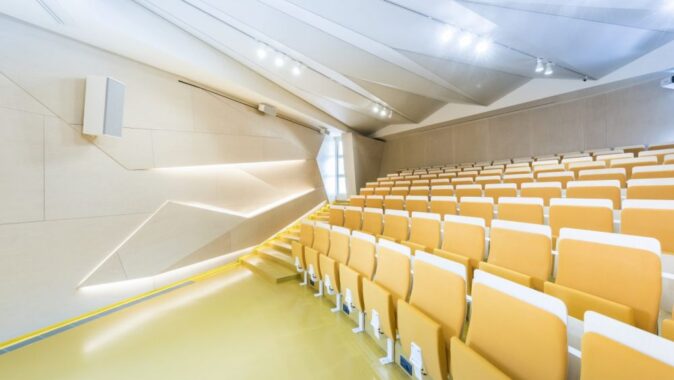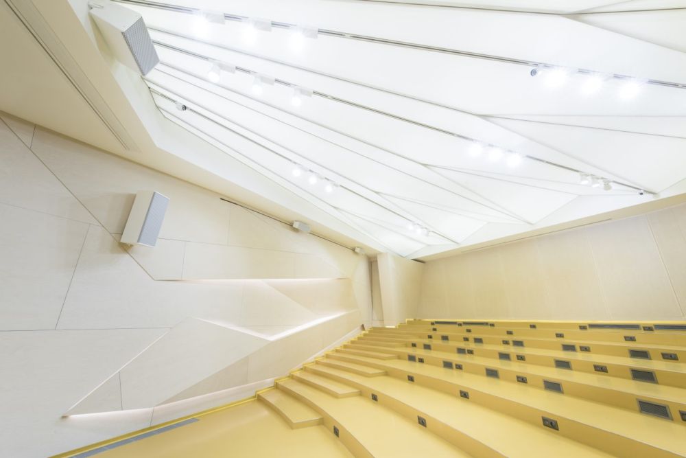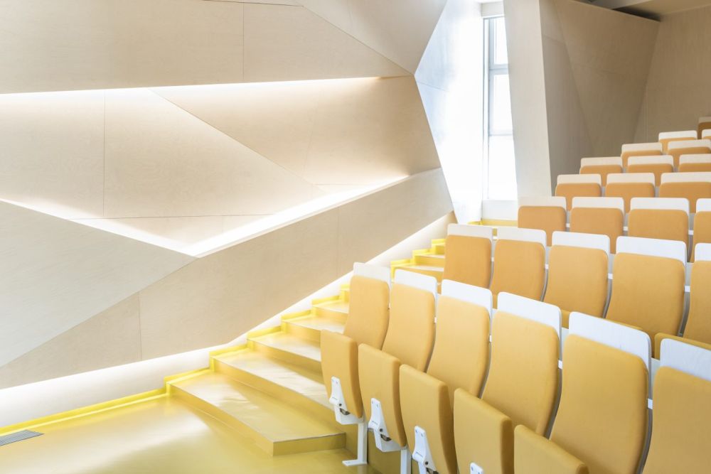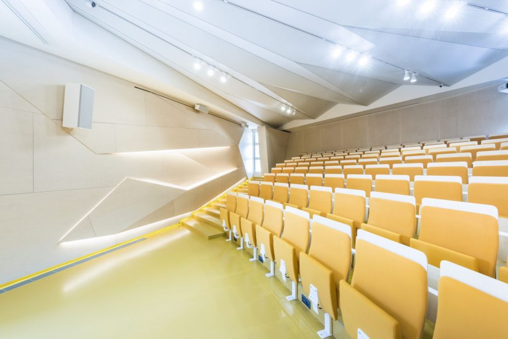 Přes všechny soudobé rekonstrukce byla v architektuře campusu cítit přítomnost ducha 70 let. Proto je naše výtvarné řešení ovlivněno dobovou architekturou a užitým uměním 70 let. Hlavní myšlenka byla postavena na expresivním tvarovém řešení stropu a stěn jako dvou samostatných útvarů. Tvarové řešení stropu vychází z půdorysu sálu, který je navržen ve tvaru rozevřeného vějíře. Strop je vytvořen z pnuté fólie napínané na prostorově tvarovanou hliníkovou konstrukci. Fólie lze v celé ploše prosvítit, a strop tak působí odlehčeně. Stěny sálu jsou obložené nepravidelně naformátovanými deskami z překližky, které na sebe plynule navazují a vytvářejí polygonální tvarované plochy. Desky jsou dýhované březovou dýhou opatřenou bílou poloprůsvitnou lazurou tak, aby prosvítala kresba dřeva. Bílé tónování dřeva působí více abstraktně a dává vyniknout různému natočení ploch. Prostor tak působí více plasticky. Desky plní jak funkci akustickou, tak i estetickou. Sedadla včetně stolečků jsou provedeny rovněž v březové překližce a mají látkové čalounění v pískové barvě. Ve stejném odstínu byla vybrána podlaha z přírodního kaučuku. Sál je vybaven 125 sklápěcími křesly a 100 sklápěcími stolky. Řízený inteligentní systém umožňuje ovládat zatemňování roletami, stmívání a zapínání světel čí audio vizuální produkci.