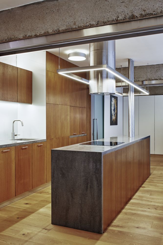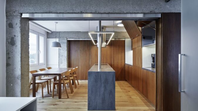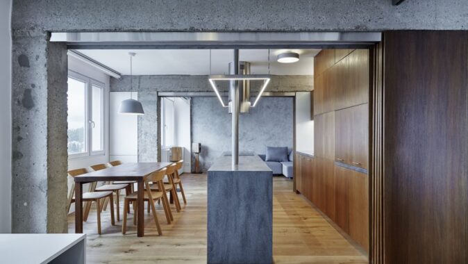 Ze vstupní haly se vchází do obývacího pokoje, do koupelny, na WC a do ložnice. Ta je také přístupná pomocí posuvných dveří z pracovny. Obývací pokoj s kuchyní, jídelním koutem a pracovnou tvoří velkorysý západní trakt přes celou délku bytu. Návrh počítal s možností oddělení pracovny a obývacího pokoje od kuchyně a jídelního koutu dřevěnou posuvnou stěnou. Z obývacího pokoje tak může vzniknout pokoj pro hosty nebo dva nezávislé celky s kuchyní uprostřed,