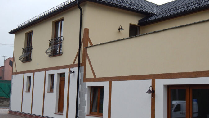 imituje hrázděné zdivo, je provedeno minerální omítkou Ceresit CT 720