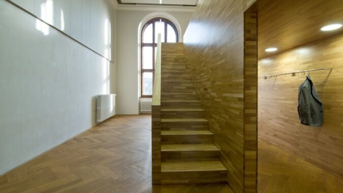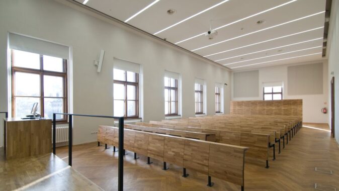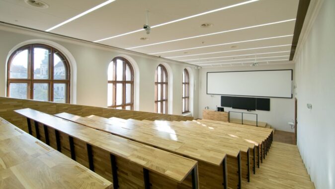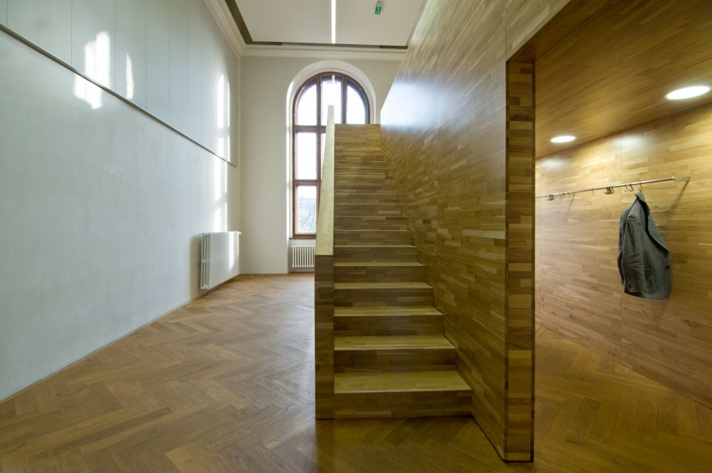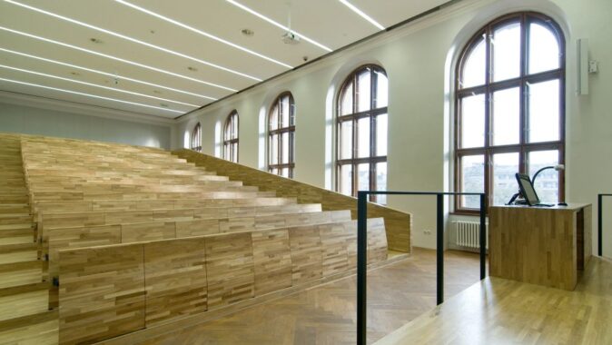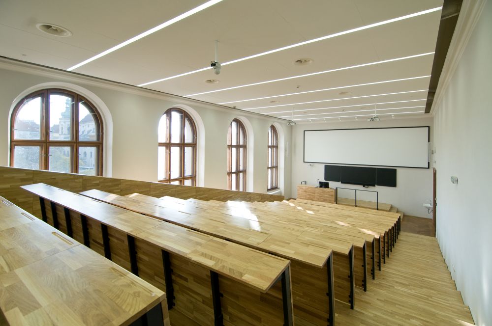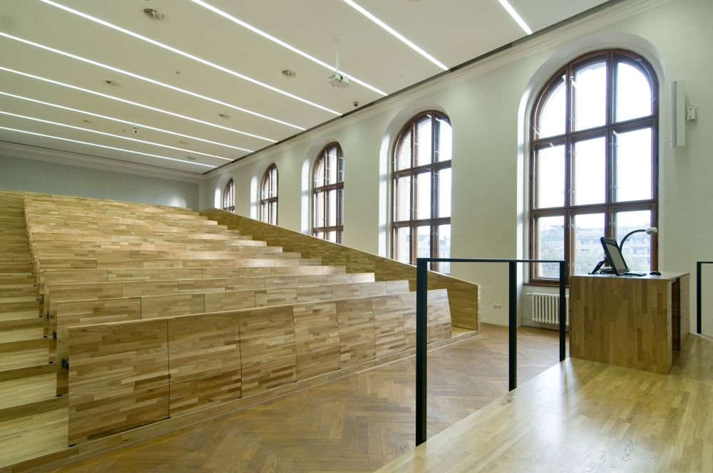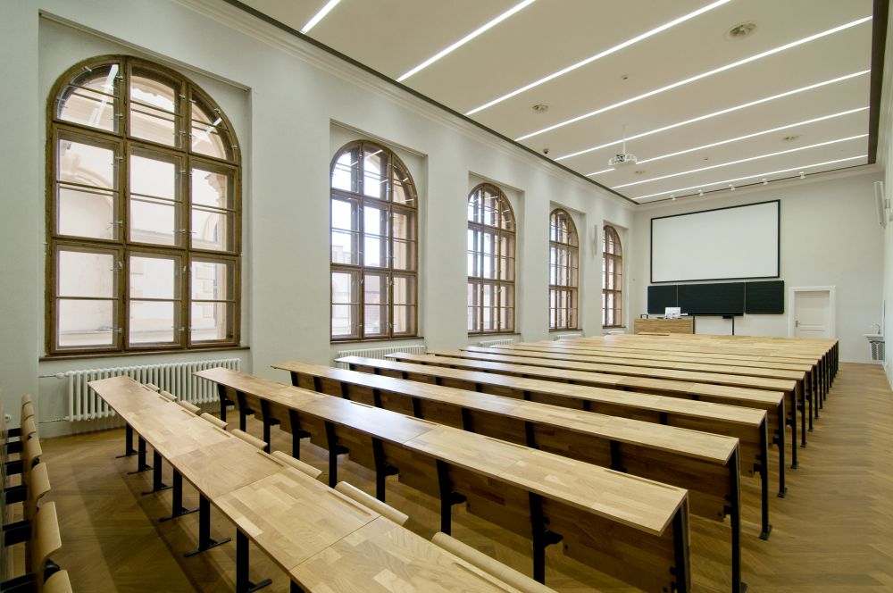 Rekonstrukce dvou podlaží historického objektu Fakulty strojní navazuje na naše dřívější realizace v areálu Českého vysokého učení technického v Praze na Karlově náměstí. V druhém a třetím podlaží jsou velké posluchárny převážně podél uličních fasád.  Byly ve špatném technickém stavu, a to nejen svým vybavením, ale také kvalitou materiálů.  Důležitým aspektem naší práce bylo co nejméně narušit charakter a historickou výzdobu jednotlivých místností památkově chráněné budovy. Nové prvky jsme proto vložili do objektu pokud možno nezávisle na původních zrekonstruovaných konstrukcích. Součástí řešení bylo i vybavení všech poslucháren moderním systémem vzduchotechniky, akustiky a audiovizuální techniky. Převážnou část této technologie v sobě ukrývají zavěšené akustické podhledy, po obvodě odsazené od stěn.