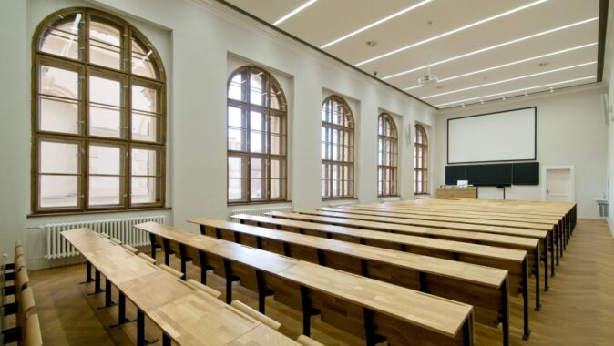 Veškerý pevný i volný mobiliář místností je nový. Výjimku tvoří dvojice poslucháren, kde byly použity historické sklopné lavice s pracovní deskou, vybrané ze zachovalých kusů a repasované do původní podoby.