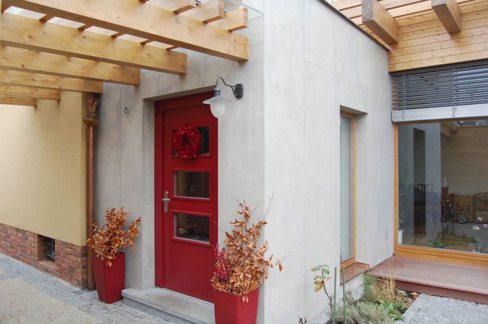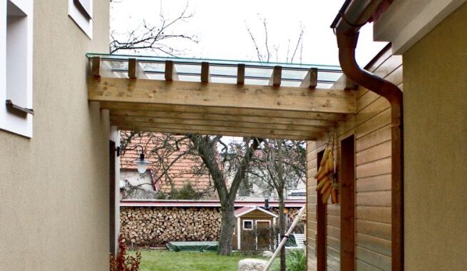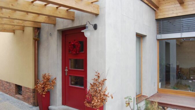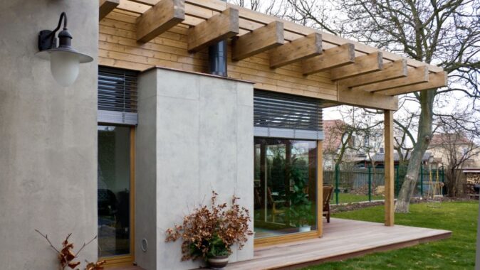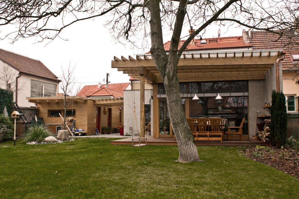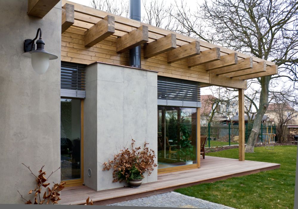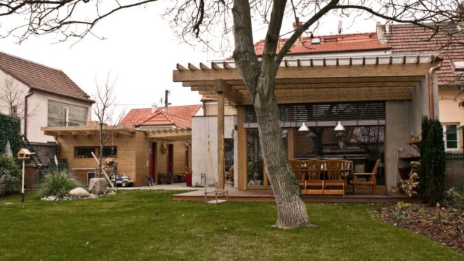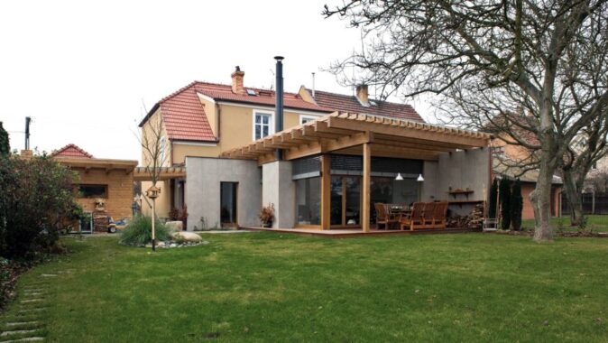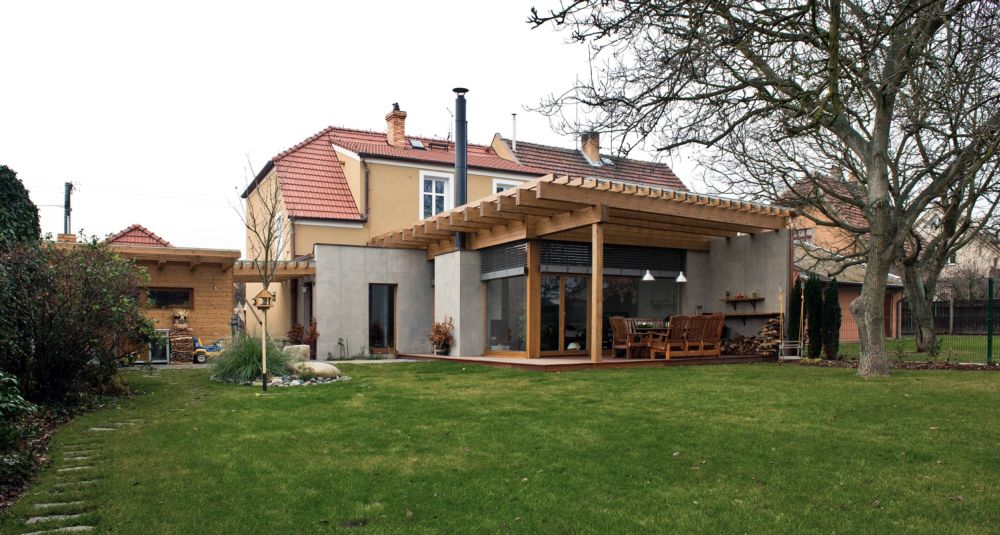 Přístavba je zděná a má extenzivní zelenou střechu z dřevěných lepených vazníků
