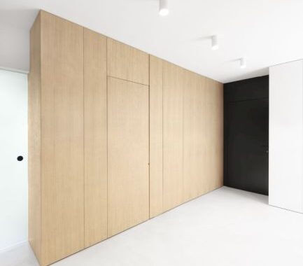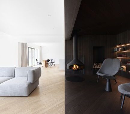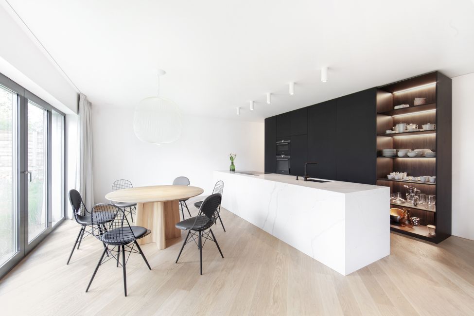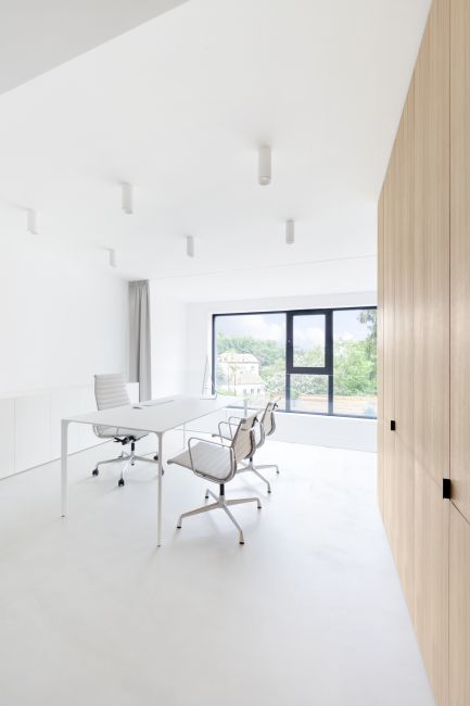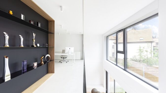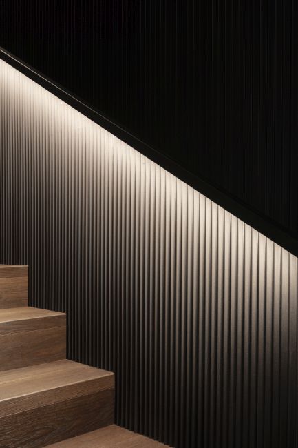 Velké plochy uvedených materiálů pak autoři doplnili zařizovacími prvky v kontextu pojetí celého interiéru tak, aby na sebe zbytečně neztrhávaly pozornost. A i proto zvolili kliky MINIMAL z dílny rodinné manufaktury M&T ve dvojím barevném provedení. „Při výběru klik do celého domu jsme jednoznačně vsadili na mimikry – přáli jsme si takové, které přirozeně splynou s povrchem dveří. A jelikož v interiéru střídáme tmavé a světlé dveře, potřebovali jsme na to reagovat,“ líčí designéři. Na černé dveře tak zvolili kliky v matném černém titanovém povrchu, nicméně bílé v tu dobu nebyly k dispozici. „Bílý povrch pro kliky jsme už dlouho zvažovali, a když nás Roman Vrtiška a Vladimír Žák oslovili, zda by byla možnost vyrobit kliky MINIMAL v bílém provedení, rádi jsme jim vyšli vstříc,“ říká Roman Ulich z M&T.