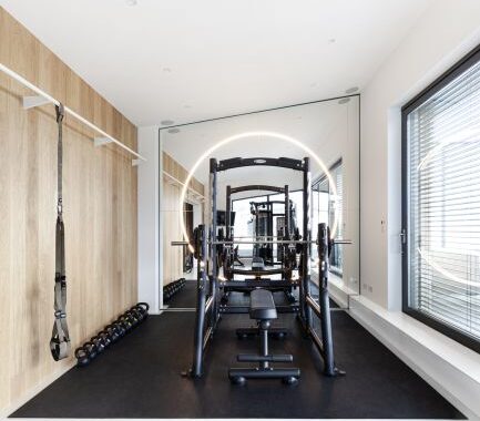 Nejvyšší a zároveň plochou nejmenší poschodí autoři původně zamýšleli jako ideální prostor pro ložnici. Patro totiž skýtá impozantní výhled přes řeku na celou Prahu, přes Stromovku až na Letnou. „Toto řešení se logicky nabízelo. Po společných diskuzích s majiteli se však ukázalo, že oni si zde ložnici nepřejí. Naopak vyjádřili přání zde vybudovat fitness prostor,“ vysvětluje Vladimír Žák, a pokračuje: „Jelikož se jedná o profesionální sportovce, v posilovně tráví opravdu spoustu času. Navzdory původním úvahám a přesvědčení jsme tedy dospěli k tomu, že pro tyto specifické klienty bude fitness v nejvyšším poschodí s nejkrásnějším výhledem tím ideálním řešením.“ Celé patro je věnováno tréninkové aktivitě, součástí je také ledová lázeň, bar a koupelna. Posilovna pak plynule navazuje na venkovní terasu.